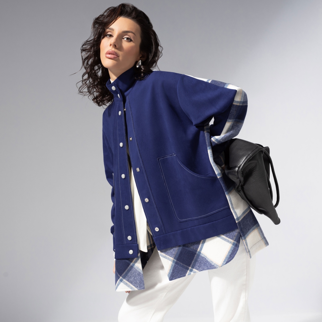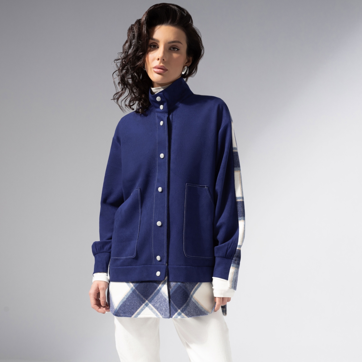 Комбинированная модель из мягкой экозамши и пальтовой фланели. Прямой силуэт, удобные карманы, контрастная отделка швов. Легко комбинируется с денимом и базовыми брюками.