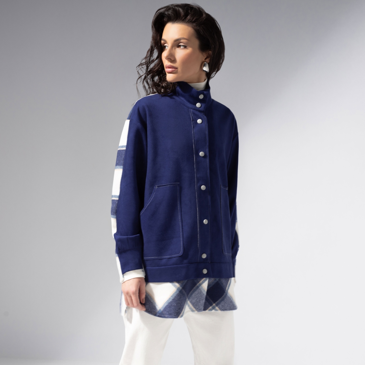 Комбинированная модель из мягкой экозамши и пальтовой фланели. Прямой силуэт, удобные карманы, контрастная отделка швов. Легко комбинируется с денимом и базовыми брюками.