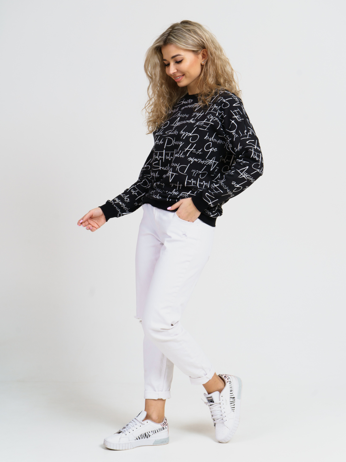 Классический женский свитшот. Рукав спущенный, горловина округлая и обработана в цвет манжетов. Толстовка подойдет на любое время года. Для прогулок, отдыха и даже спорта.