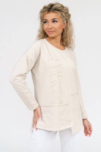 Удобная стильная женская толстовка-туника для тех, кто следит за модой и хочет быть в тренде! Модель свободного кроя в стиле "оверсайз", плечо спущенное. Низ изделия ассиметричный, по бокам разрезы. На полочке оригинальный принт и внутренний карман. Отличный вариант к джинсам, брюкам, шортам, леггинсам. Ткань - футер двухнитка с добавлением лайкры. Мягкая и шелковистая, приятная к телу, прекрасно сидит на фигуре и великолепно держит форму.