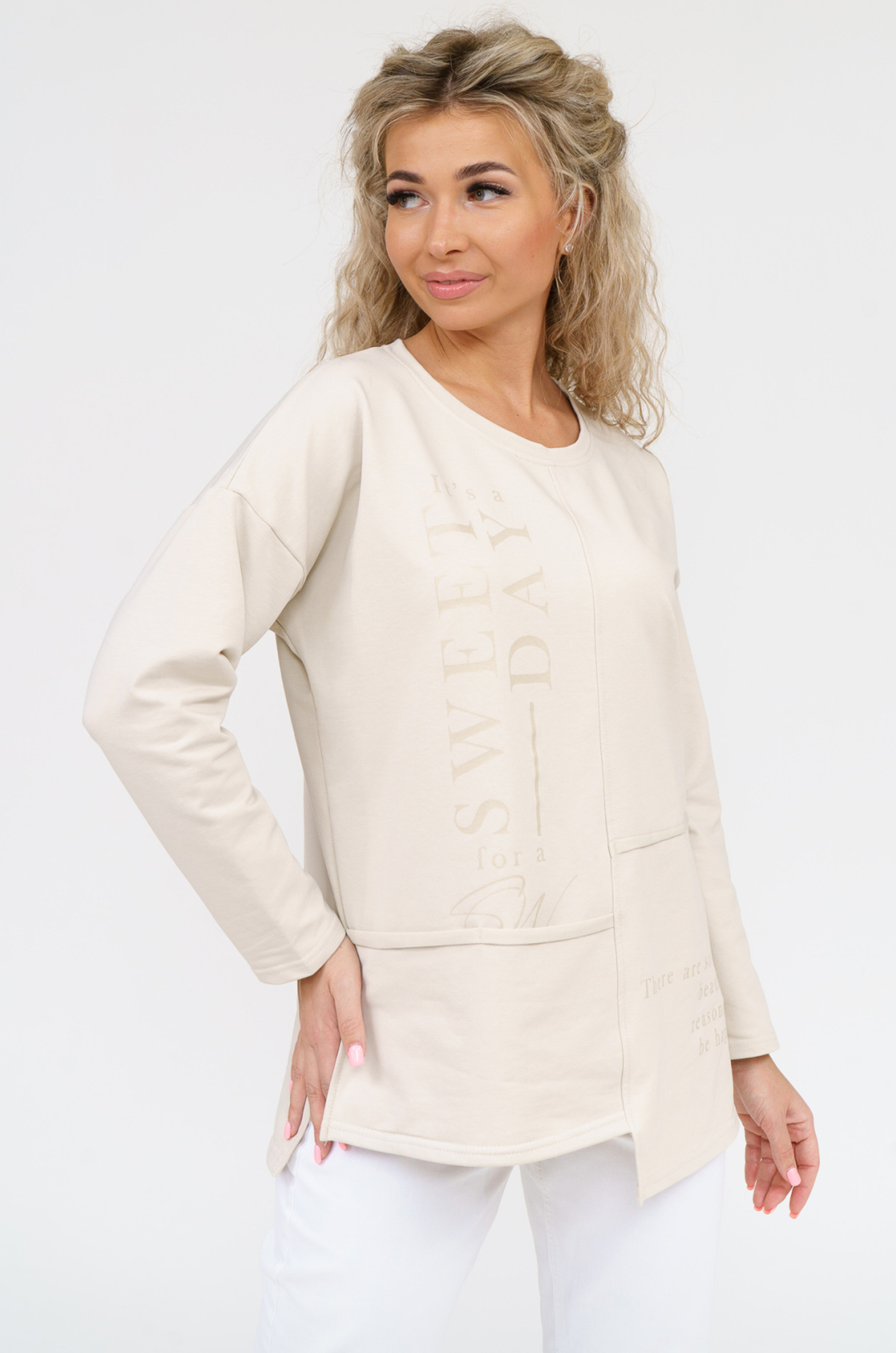 Удобная стильная женская толстовка-туника для тех, кто следит за модой и хочет быть в тренде! Модель свободного кроя в стиле "оверсайз", плечо спущенное. Низ изделия ассиметричный, по бокам разрезы. На полочке оригинальный принт и карман. Отличный вариант к джинсам, брюкам, шортам, леггинсам. Ткань - футер двухнитка с добавлением лайкры. Мягкая и шелковистая, приятная к телу, прекрасно сидит на фигуре и великолепно держит форму.