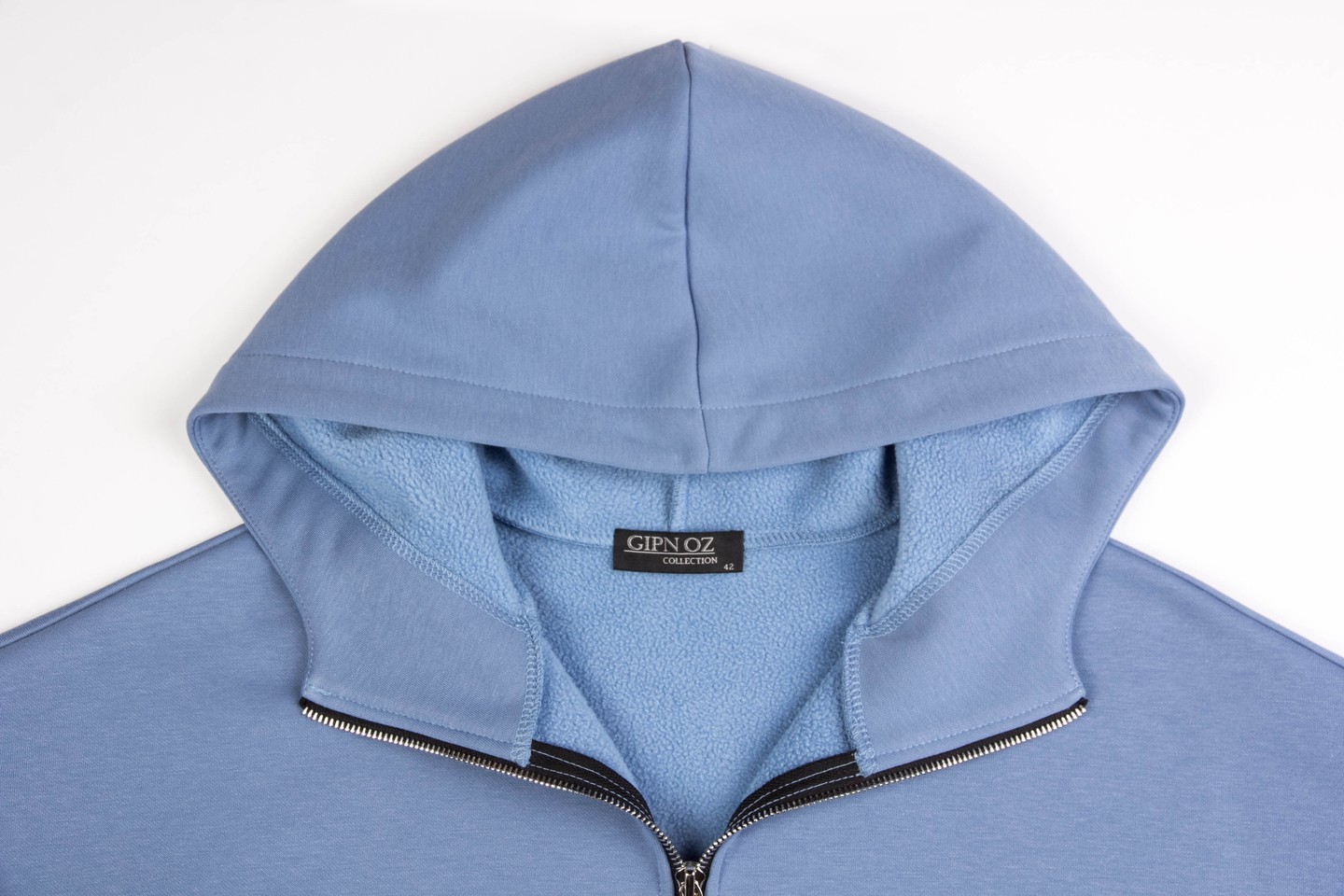 голубой Настала пора холодов, а значит, пора утепляться В наше время выглядеть стильно и модно, и при этом чувствовать себя комфортно стало возможным даже в самое холодное время года. Подарит вам удобство и не даст замерзнуть морозным днем толстовка из утепленного трикотажа. Толстовка «оверсайз» с капюшоном. Застежка и карманы на «молниях». На спинке пришивной металлический декор. Низ изделия и низ рукава обработаны поясом и манжетами. Трикотаж утепленный на флисе, состав: 75% хлопок, 20% полиэстер, 5 % спандекс.
