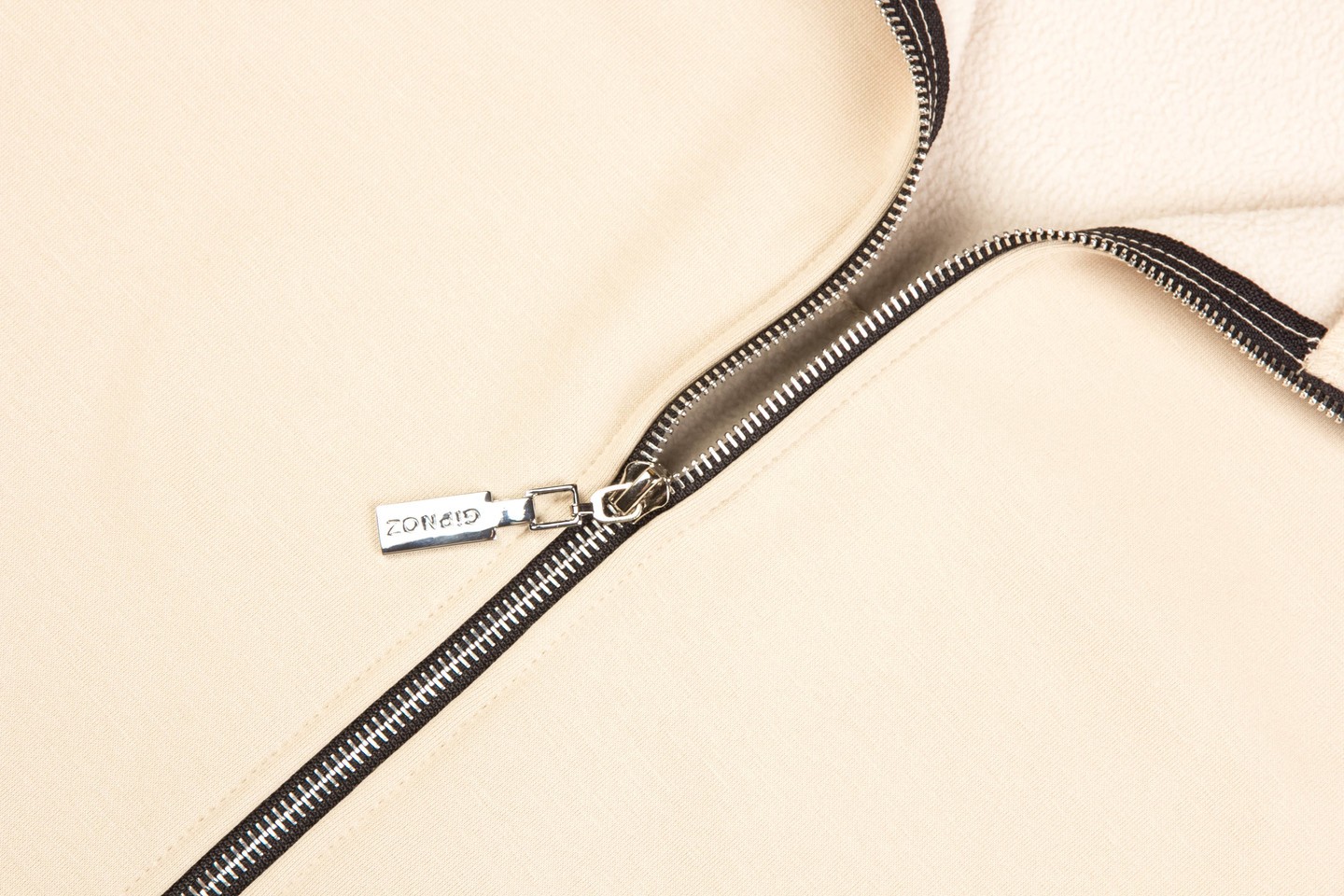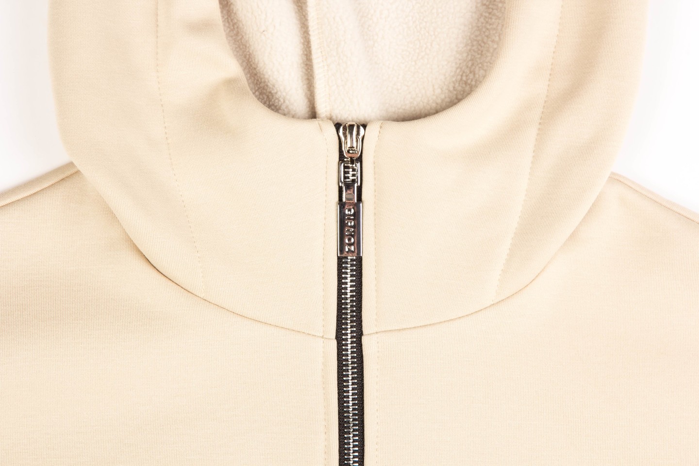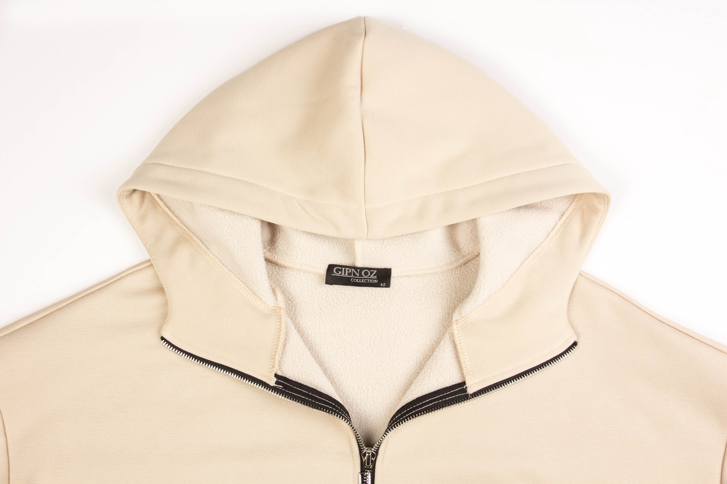 бежевый Настала пора холодов, а значит, пора утепляться В наше время выглядеть стильно и модно, и при этом чувствовать себя комфортно стало возможным даже в самое холодное время года. Подарит вам удобство и не даст замерзнуть морозным днем толстовка из утепленного трикотажа. Толстовка «оверсайз» с капюшоном. Застежка и карманы на «молниях». На спинке пришивной металлический декор. Низ изделия и низ рукава обработаны поясом и манжетами. Трикотаж утепленный на флисе, состав: 75% хлопок, 20% полиэстер, 5 % спандекс.