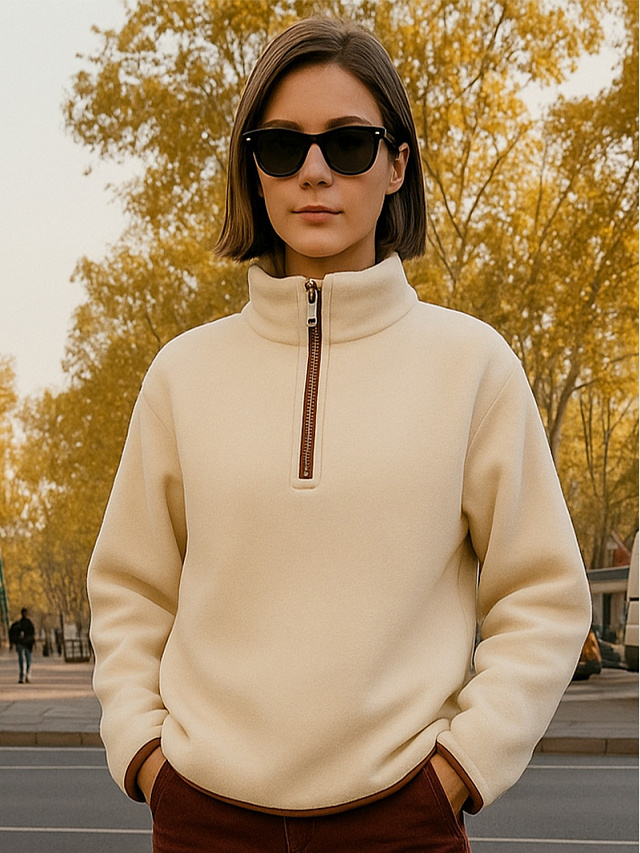 Бежевая женская толстовка из мягкого флиса станет уютным дополнением вашего гардероба. Свободный крой с круглой горловиной и стойкой обеспечивает комфорт в течение всего дня. Застежка-молния по центру и мягкие спущенные плечи создают расслабленный силуэт, не сковывающий движений.
