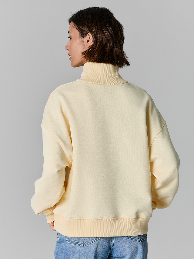 Женская толстовка на молнии станет незаменимой частью вашего повседневного гардероба. Модель, выполненная из высококачественного футера, который отлично сохраняет тепло и при этом позволяет коже дышать, идеальна для прохладной погоды. Толстовка свободного силуэта оверсайз с круглой горловиной и воротником-стойкой добавит современный и стильный акцент в образ. Центральная застежка-молния позволяет ее легко надевать и снимать, а длинные рукава с эластичными манжетами из рибаны обеспечивают удобство и тепло. Спущенное плечо придает модели непринужденный и современный вид. Эта толстовка прекрасно сочетается с джинсами, леггинсами или спортивными брюками, создавая стильный и удобный образ для любых ситуаций. Независимо от того, идете ли вы на прогулку, встречаетесь с друзьями или просто отдыхаете дома, эта толстовка обеспечит комфорт и уверенность каждый день.