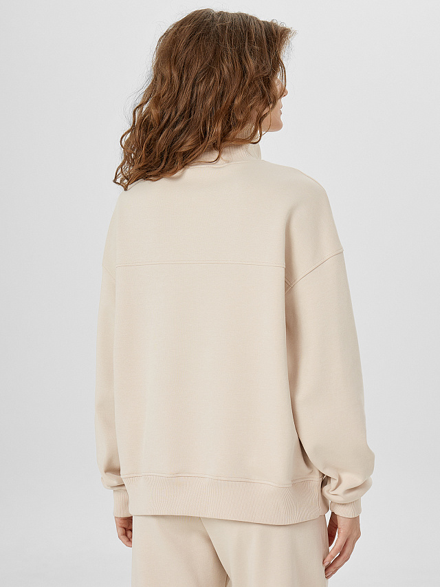 Женская толстовка прямого силуэта выполнена из интерлока — мягкого, плотного трикотажного материала, который хорошо держит форму и обеспечивает комфорт в носке. Свободный крой не ограничивает движения и подходит для любого типа фигуры. Спереди расположена декоративная деталь, плавно переходящая в воротник-стойку из рибаны, что придает изделию оригинальность и дополнительную защиту от ветра. Центральная застежка на молнию делает модель удобной и практичной. Длинные рукава дополнены манжетами из рибаны, а спущенная линия плеча подчеркивает расслабленный стиль. По низу толстовка оформлена поясом из рибаны, который аккуратно фиксирует изделие и завершает образ. Такая модель идеально подойдёт для повседневной носки, прогулок или отдыха, сочетая в себе уют, стиль и функциональность.