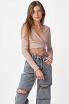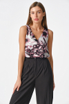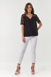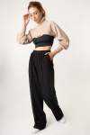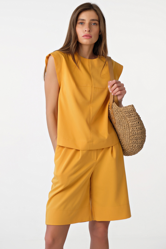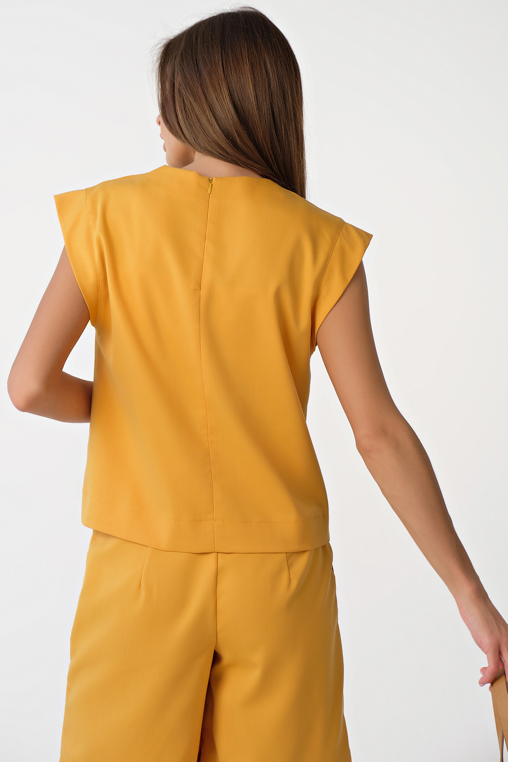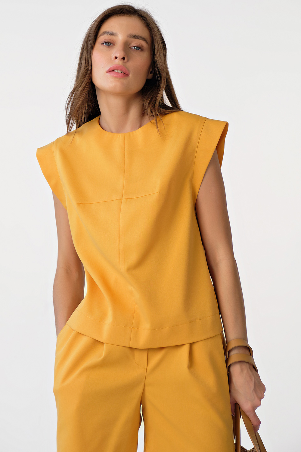 • Особенности: Топ прямого силуэта из костюмной ткани. Детали: вертикальное сечение по переду, нагрудные вытачки от центрального шва, горловина обработана обтачкой, рукав-крылышко, широкая подгибка по низу. Застежка на молнию по спинке.