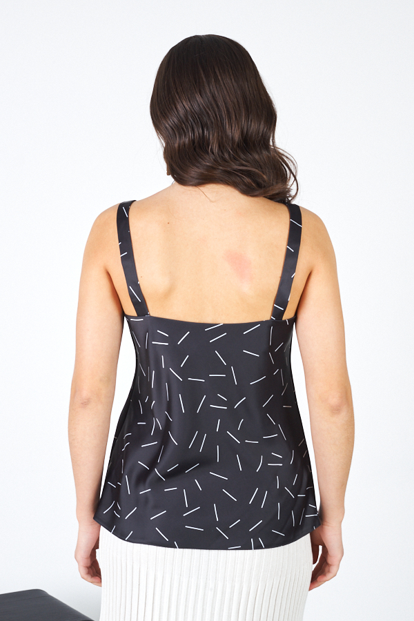 Топ с «качелями» в зоне декольте смотрится очень женственно. Изделие на бретелях полуприлегающего силуэта из атласной блузочной ткани.