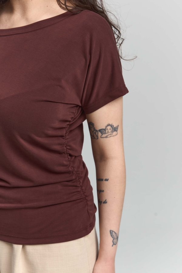 Ассиметричный трикотажный топ с цельнокроенным рукавом и спущенным плечом.