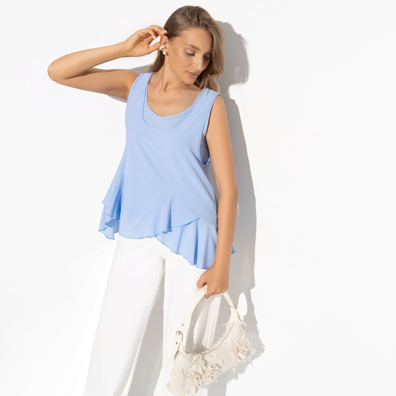 В списке обязательных дел значится поход в цветочный магазин за букетом для себя. Этим делом нельзя пренебрегать. Переносить тоже нельзя. Выбирайте топ в голубом цвете, он как нельзя лучше подходит для свидания с собой. Топ без рукавов с круглым вырезом. Линия выреза имитирует два слоя изделия. Оформлен рюшами.