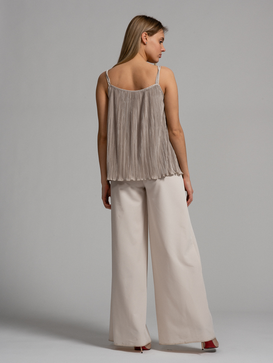 Топ на брителях с кольцами из атласной ткани-плиссе. На моделе топ 42 размера. Рост модели 173 см. Машинная деликатная стирка. Отжимать только вручную. Сушить строго в вертикальном положении.