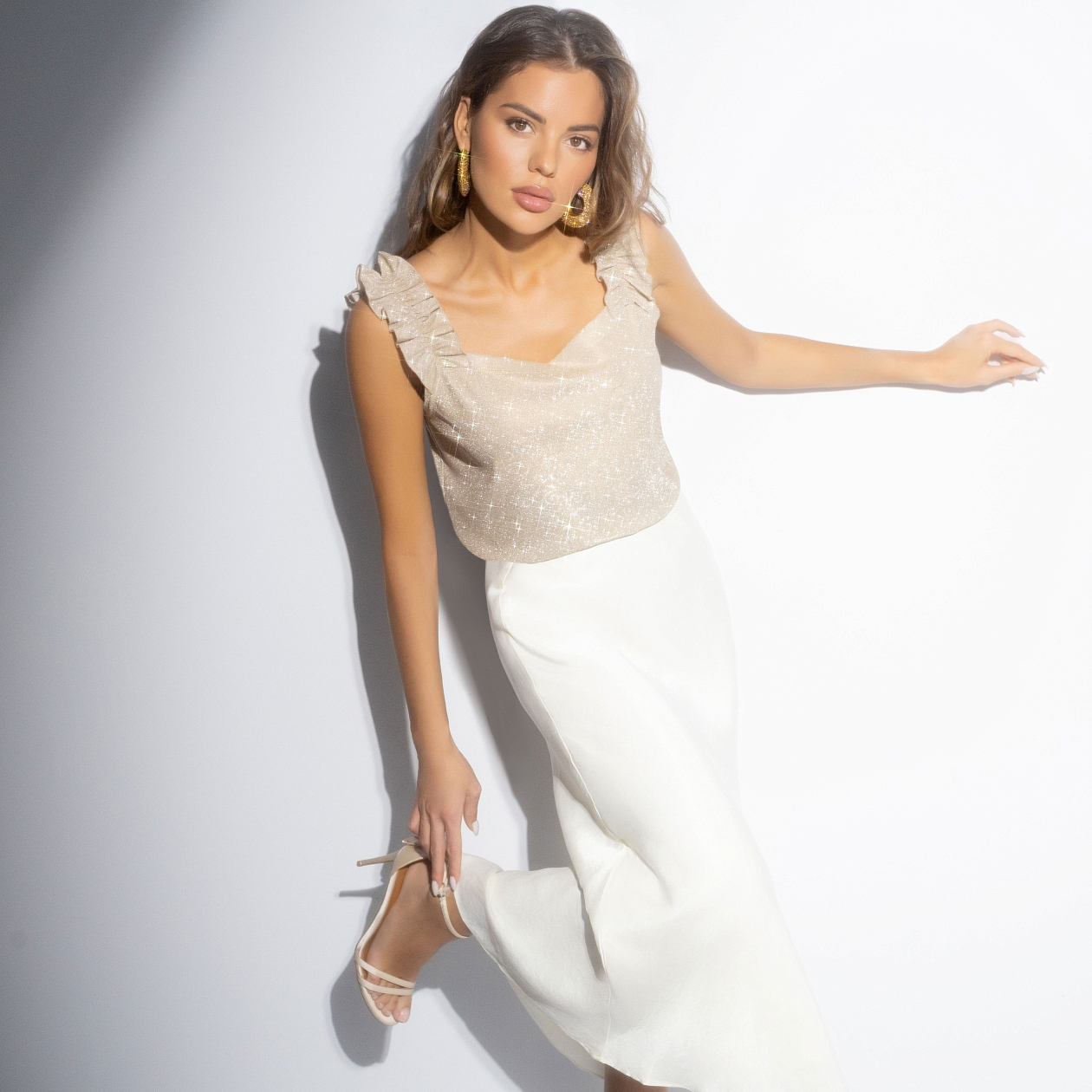 Музыка вибрирует в воздухе, стробоскоп режет темноту на вспышки света, и в каждом новом кадре – ты, смеющаяся и танцующая до утра. Кремовый топ с люрексом отражает тысячи огней, превращая тебя в главную героиню ночи, за которой следит весь танцпол. Аккуратный фигурный вырез мягко подчеркивает линию плеч и зону декольте. Оборки по бретелям добавляют образу игривости, а прямой силуэт легко сочетается и с юбками, и с брюками.