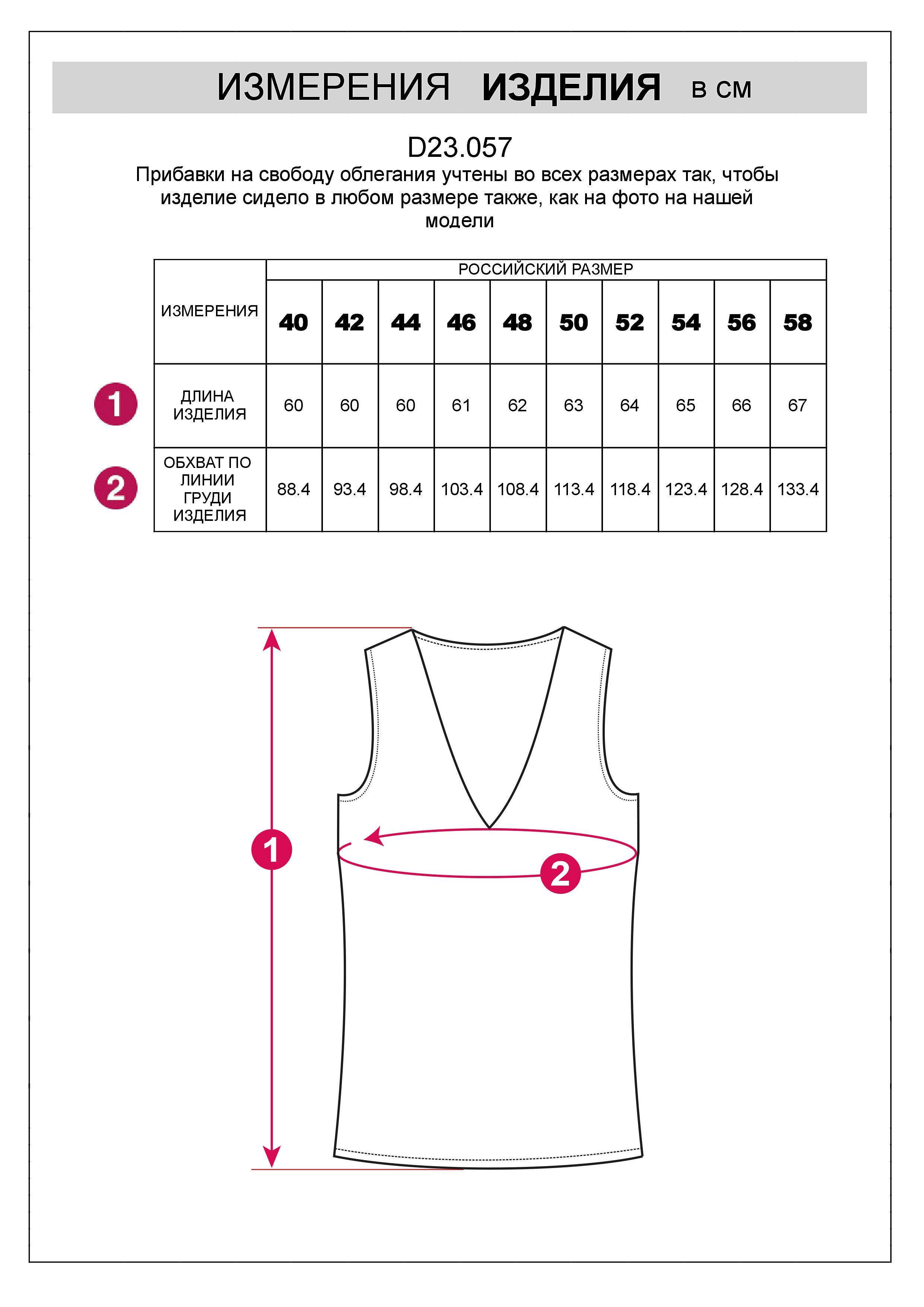 Топ с V-вырезом выполнен из тончайших нитей плотного сатина, плетение которых создает полуматовый блеск, напоминающий натуральный шёлк. Модель, скроенная по косой мягко, струится по телу и почти не мнется. Совет стилиста: сочетайте топ в костюме вместе с брюками D24.534 и юбкой D26.461 чтобы создать роскошный праздничный образ, или используйте как яркий акцент в базовом гардеробе, с вязаными вещами, денимом и эко-кожей.