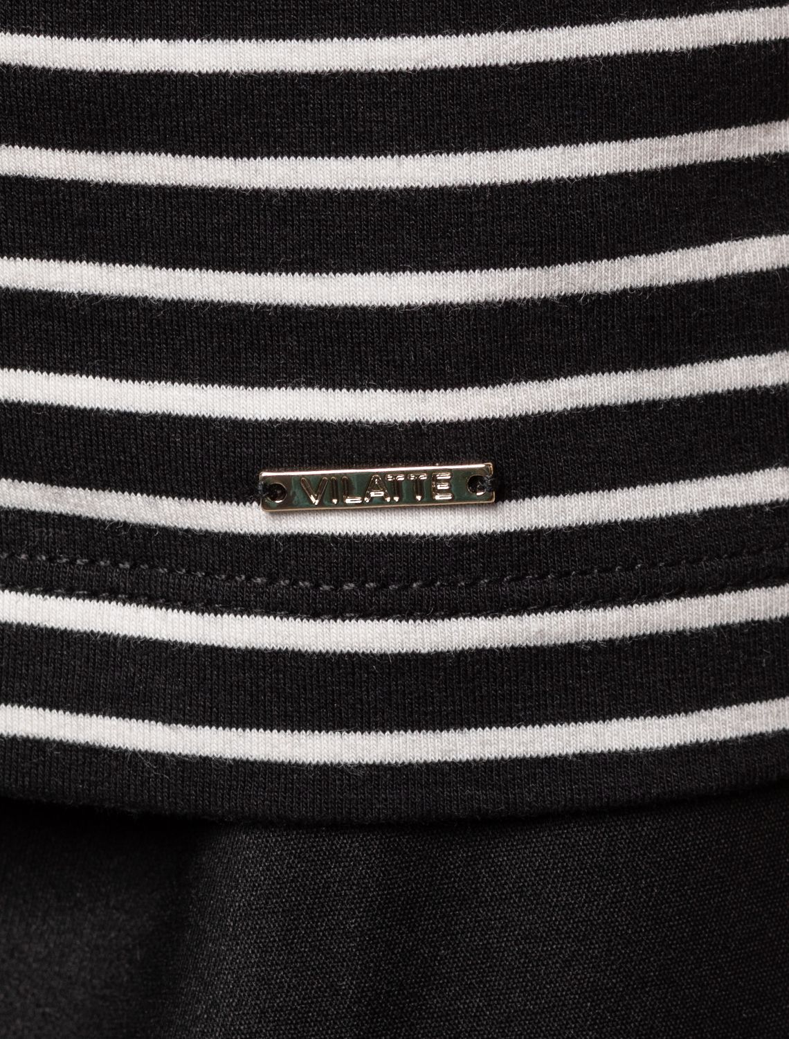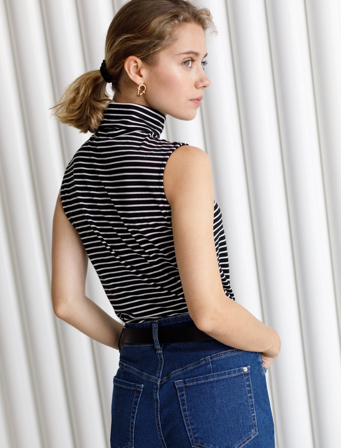 Топ с воротом как у водолазки выполнен из премиального хлопка. Наличие эластана в составе изделия способствует формоустойчивости. Модель хорошо будет сочетаться в комплекте с жакетом или кардиганом, так как отсутствие рукавов позволит комфортное использование в многослойных образах. Из украшений металлический логотип бренда.