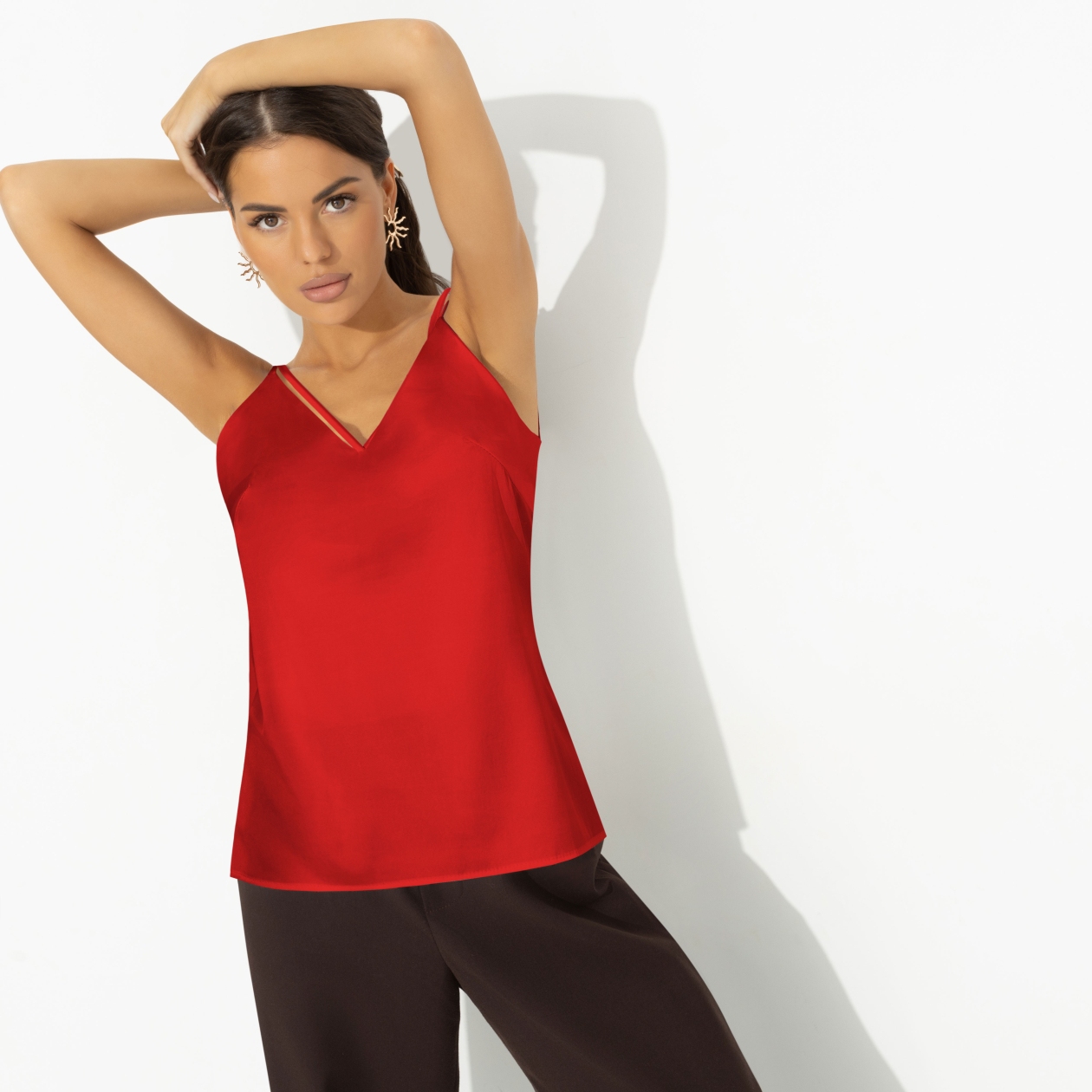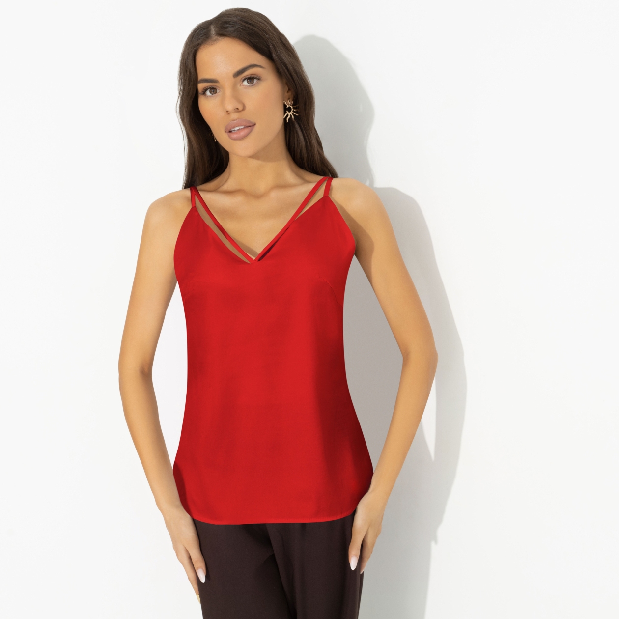 В психологии личностного роста есть упражнение на повышение самооценки. Надеваете вещь яркого красного цвета и уверенно смотрите в глаза всем, кто вам встретится в этот день. Задача – с достоинством принимать все знаки внимания. Приступайте к выполнению в блузе CHARUTTI и ваша самооценка взлетит к небесам. Блуза на тонких бретелях. Приталенный силуэт. Хорошо смотрится в заправленном виде и навыпуск. Ошибка при загрузке данных! (https://charutti.ru/upload/video-ozon-covers/00000011931_video_ozon.mp4)