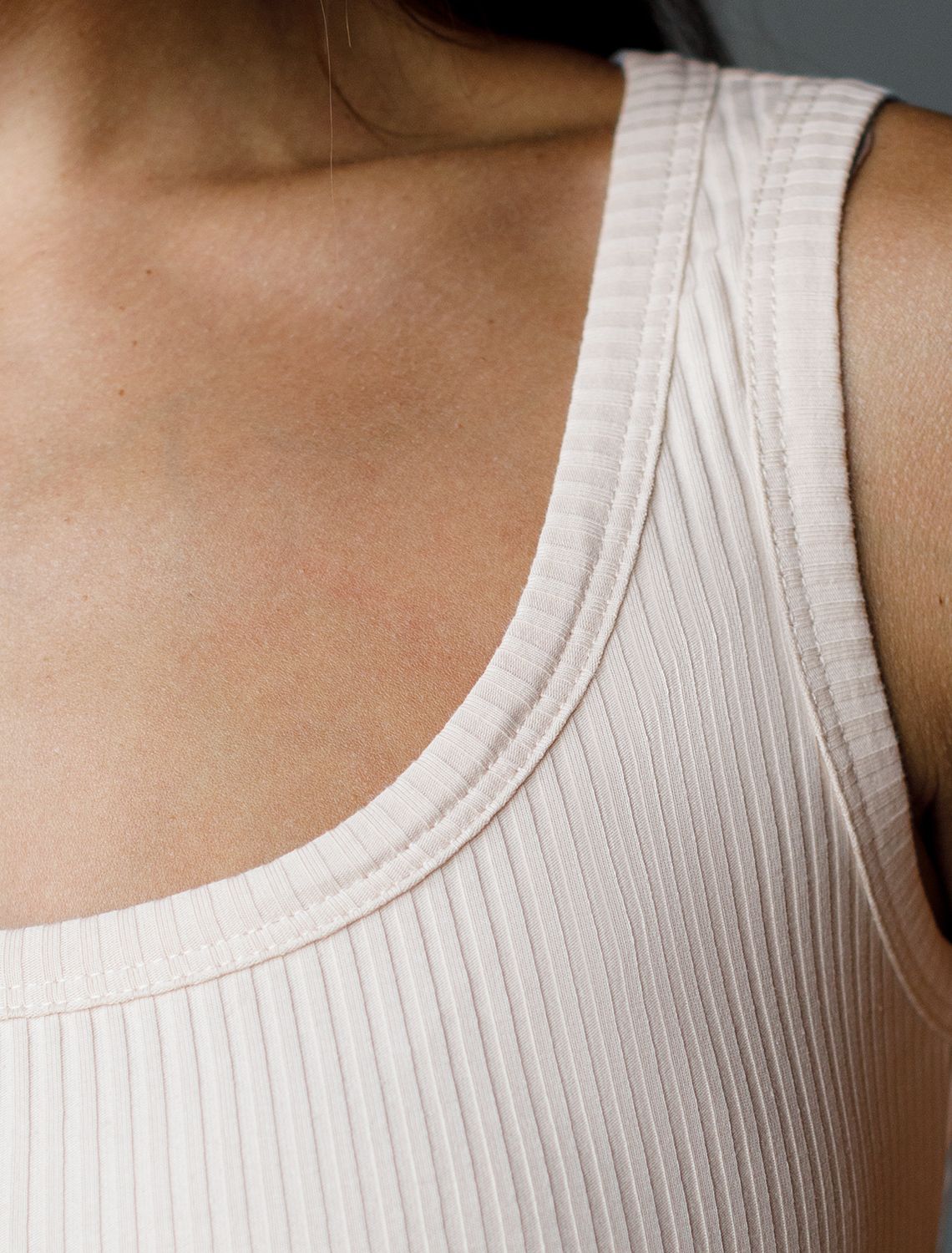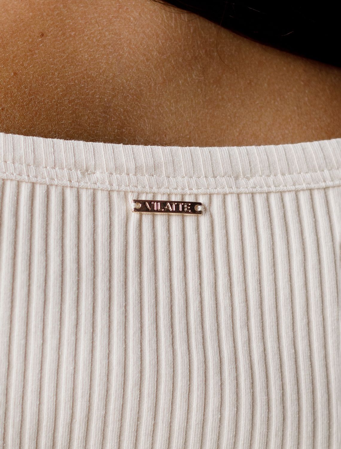 Топ выполнен из трикотажа в широкий рубчик. Эластичный хлопковый трикотаж идеально сидит по фигуре, не сковывает движений и очень комфортный в носке. Фактура вертикальных полос визуально стройнит и вытягивает силуэт. Базовое изделие хорошо впишется в любой гардероб. Идеально подходит для многослойных образов в базовый гардероб.