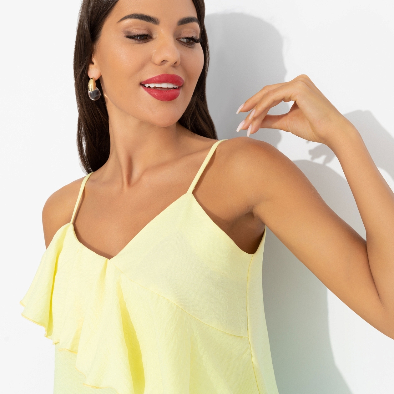 Он продемонстрировал удивительные возможности человеческого тела, когда смог повернуть голову на 180 градусов, чтобы проводить тебя взглядом. В топе ЧАРУТТИ ты приковываешь внимание. Топ прямого силуэта на тонких бретелях. Дополнен объемным несъемным воланом.