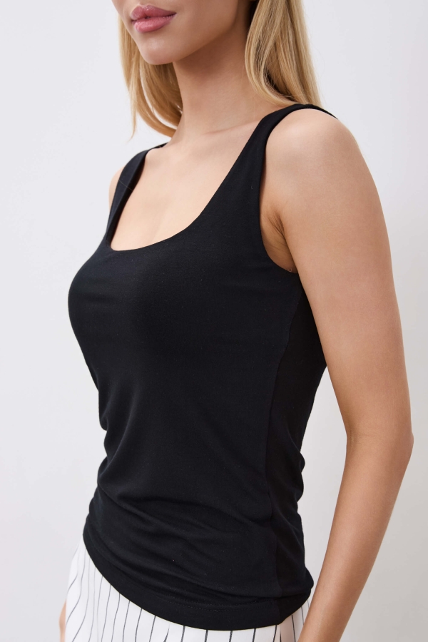 Базовый топ из трикотажного полотна. Прилегающий силуэт, низ ровный. Лиф двойной на широкой обтачке.