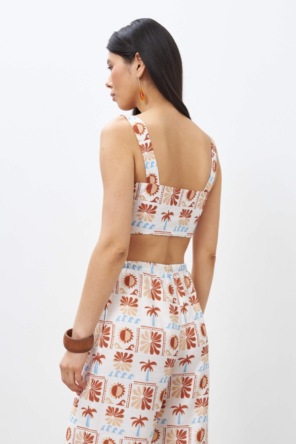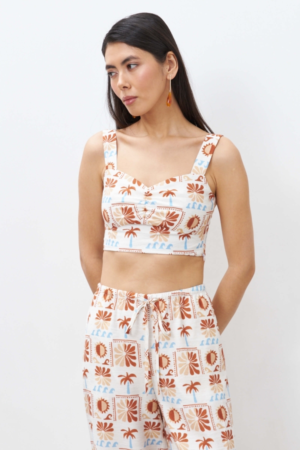 Женственный топ из фактурного вискозного полотна с трендовым принтом. Прилегающий топ со сборкой и фигурным подрезом под грудью, широкими бретелями, застежка на молнию по спинке.
