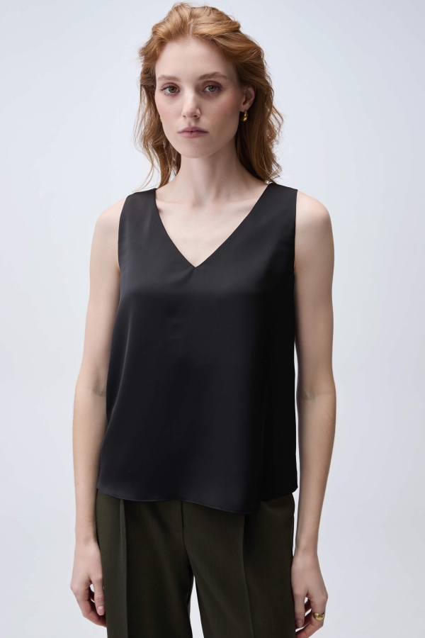 Топ из атласа высокого качества. Модель свободного силуэта с V-образным вырезом.