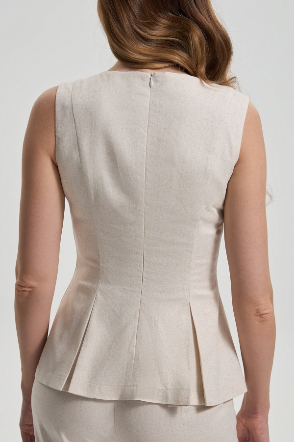 Лаконичный топ из льняного полотна на подкладке. Модель прилегающего силуэта с баской, с рельефами и защипами на полочке и спинке. Застежка на потайную молнию на спинке. Изделие на подкладке из легкого хлопка.