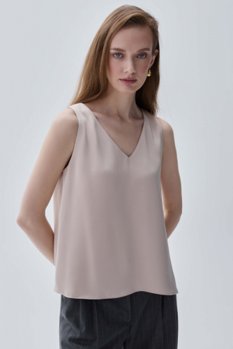 Топ из фактурного атласа. Модель свободного силуэта. По спинке застежка на петлю и пуговицу. В комплекте узкий пояс из основной ткани.