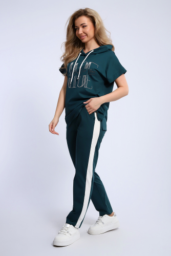 Костюм состоит из толстовки и брюк. Толстовка прямого кроя с капюшоном на завязках, рукава на манжетах. Брюки полуприлегающего силуэта с боковыми карманами, эластичным поясом на резинке и манжетами. Оригинальное сочетание рисунка толстовки и черных брюк.