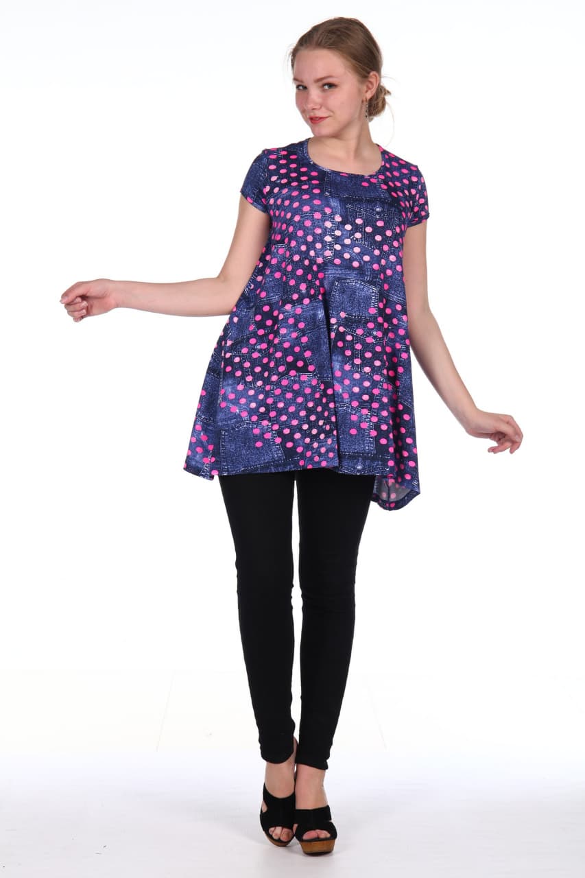 Свободная туника трапециевидного кроя модной джинсовой расцветки с яркими горошинами.