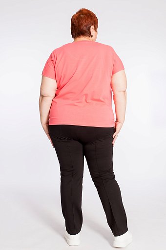Футболка из однотонной кулирки с лайкрой. Горловина мягкой V-образной формы, линия плеча спущена. В плечевых швах небольшие разрезы, а снизу боковых швов - декоративные сборки.