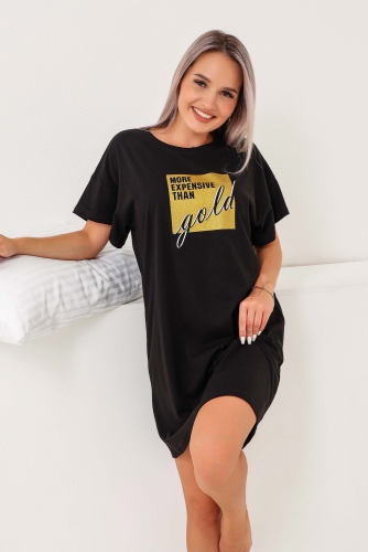 Платье-туника свободного кроя с широкими рукавами. Фасон подходит для всех типов фигуры. Горловина округлой формы обработана втачной планкой. Длина рукава указана от основания шеи. Принт изображает панораму небоскрёбов Москва-Сити.