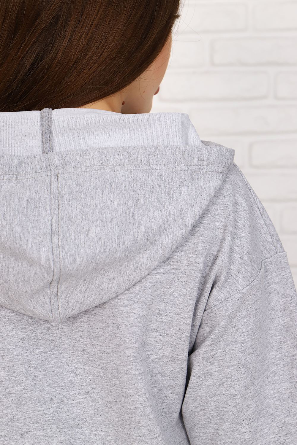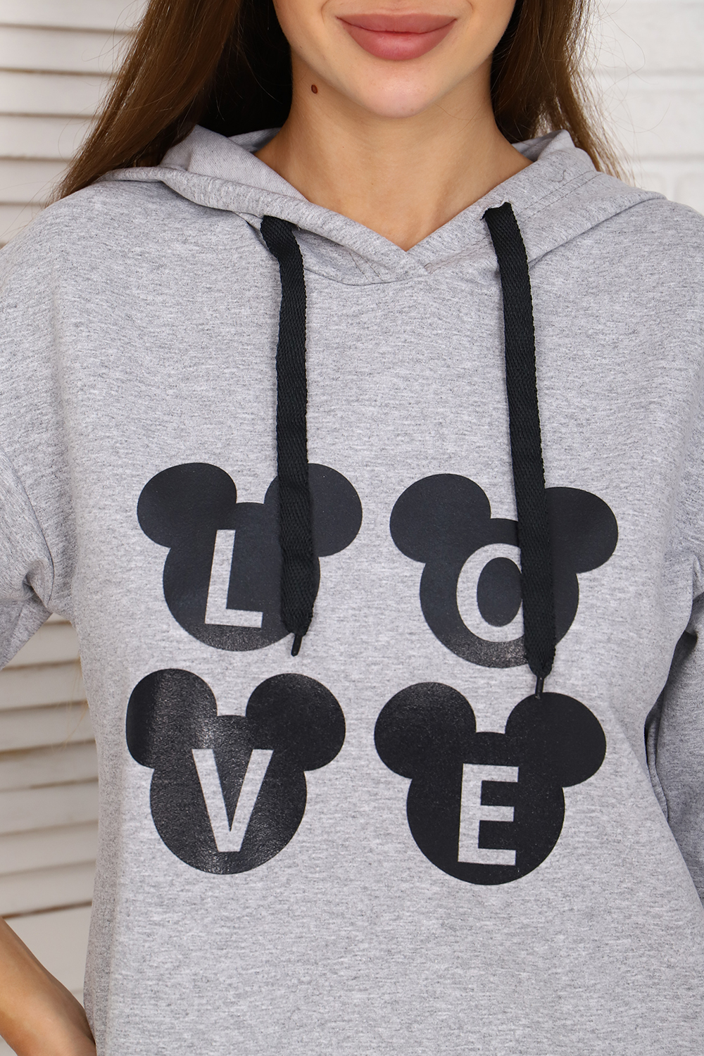 Туника с молодёжным принтом из тонкого, приятного к телу  футера 2-х нитки с лайкрой. Модель с капюшоном, спущенная пройма, короткий свободный рукав, в боковых швах удобные карманы. Принт на передней полочке гармонично сочетается с декоративным шнуром в капюшоне. Туника - это универсальная вещь, которая должна быть в гардеробе  каждой женщины, независимо от возраста и фигуры.