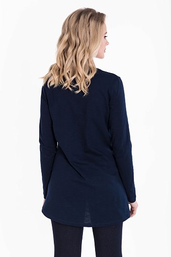 Горловина с круглым вырезом обработана бейкой из основного полотна, что создает аккуратный и завершенный вид изделия. Низ туники разноуровневый - сзади длиннее, чем спереди, что придает модели оригинальность.