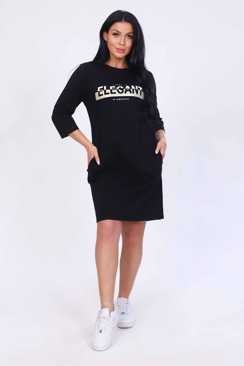 Молодежная туника из кулирки 100% хлопок. Туника полуприлегающего силуэта длиной до колен, рукав 3/4, вырез горловины круглый, два кармана. Дизайн туники дополнен стильным, элегантным принтом.