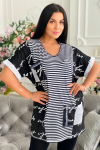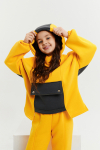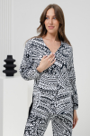 Туника женская прямого силуэта. Рукав цельнокроенный со швом. Воротник-стойка с люверсами и завязками. Верхняя часть полочки и спинки из кашкорсе. Нижняя часть туники из плотной вискозы. Вставки рукавов и полочки из яркой отделочной ткани. В нижней части полочки карман кенгуру.