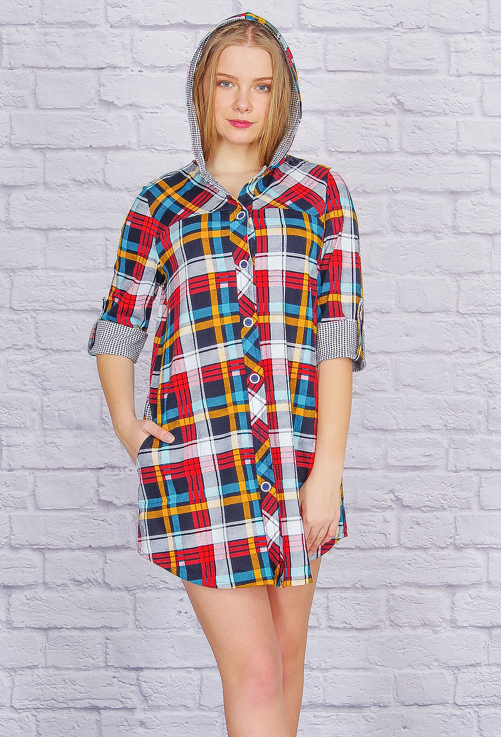 Классная туника-рубашка с капюшоном и боковыми карманами. Модель на пуговицах, рукава 3/4 с патами, не регулируются по длине, капюшон двойной. Тунику можно носить в сочетании с джеггинсами, лосинами или зауженными скинни. Можно надеть поверх футболки, что создаст стильный повседневный лук. Ткань кулирка.