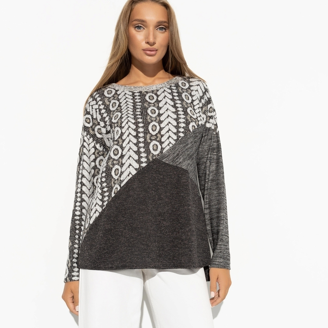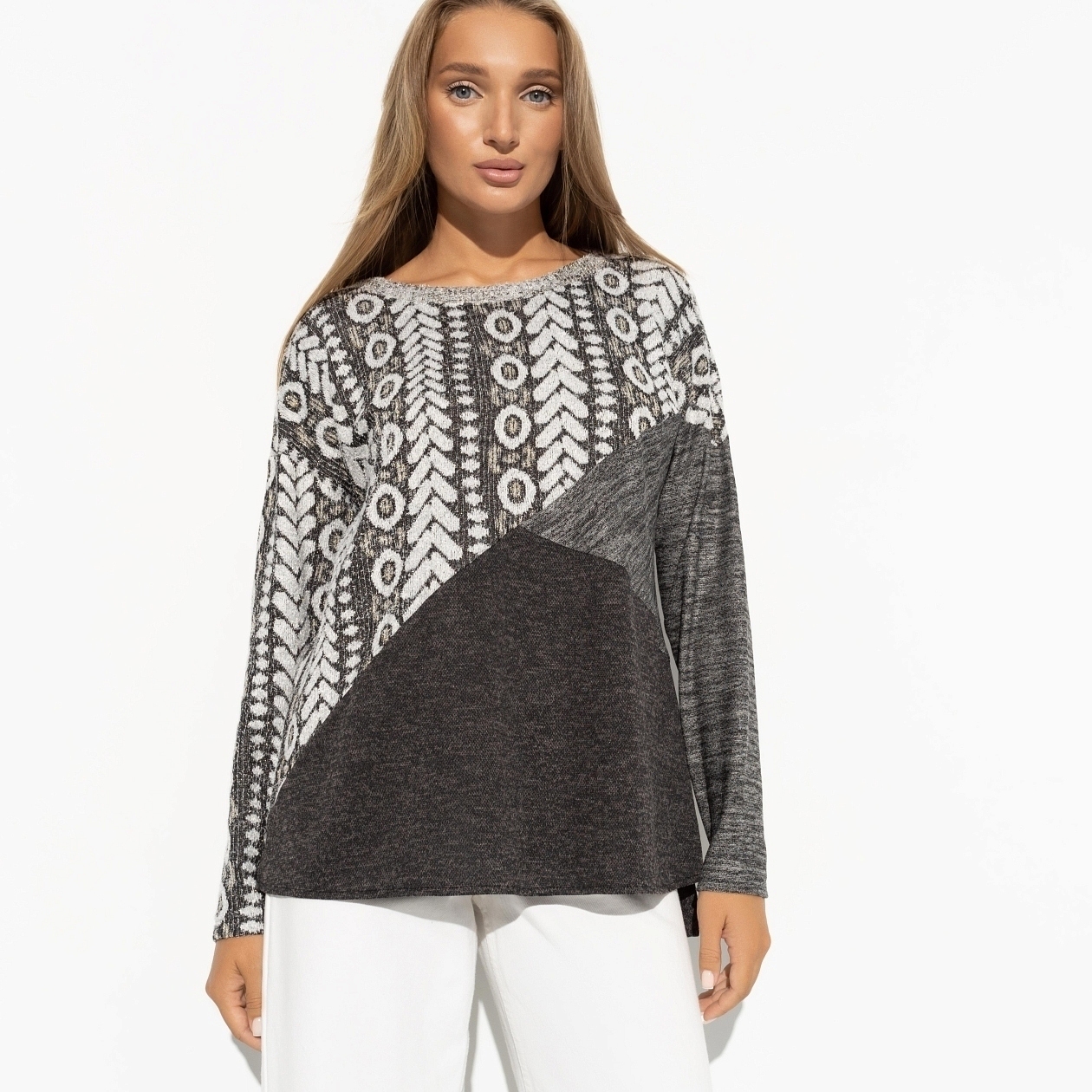 Психологическое сообщество буквально потрясла новость о том, что скромность больше не украшает. Стесняться не модно, в тренде быть аутентичной. Выбирайте тунику с этническим принтом для смелого заявления о себе. Туника свободного силуэта с длинным рукавом. Спинка слегка удлинена.