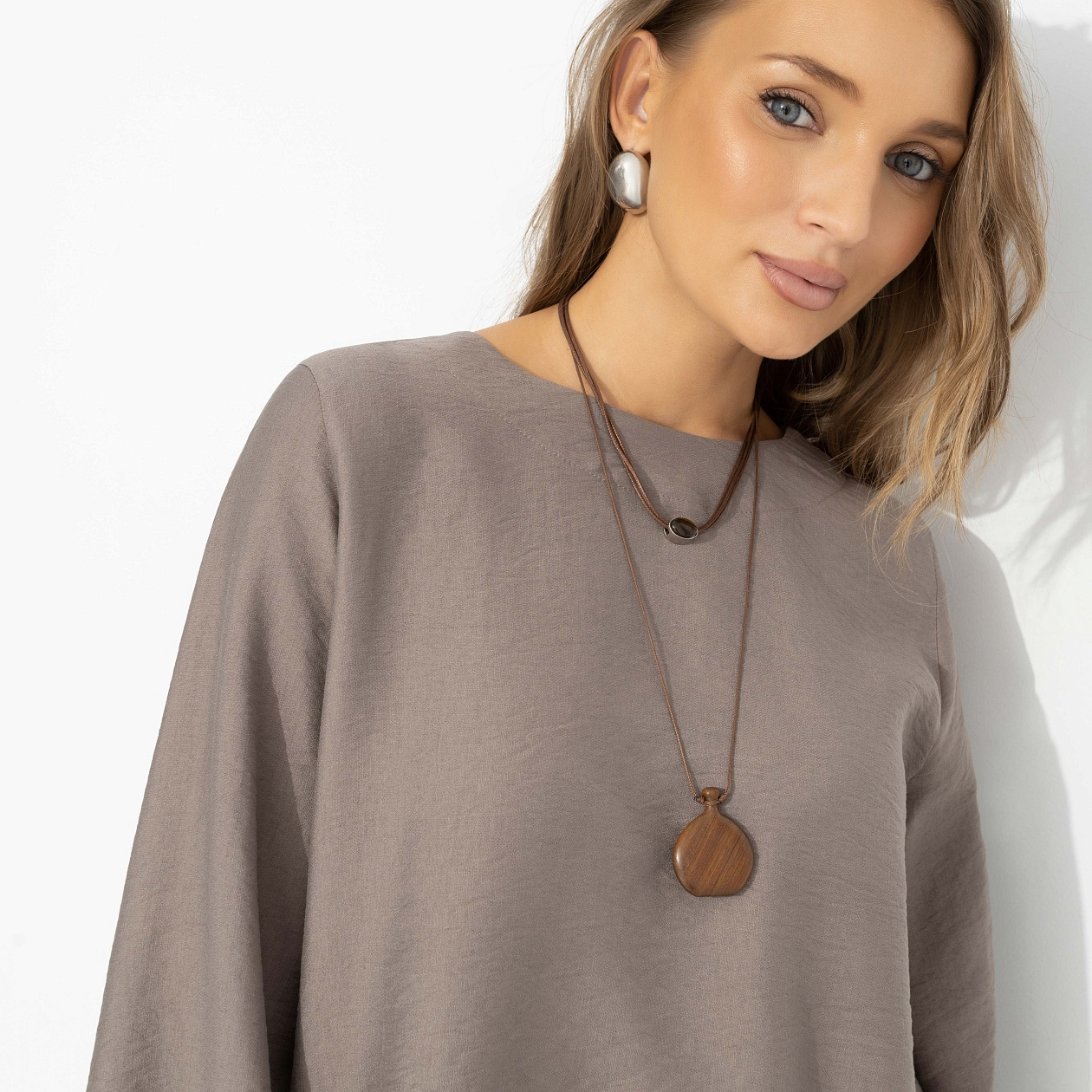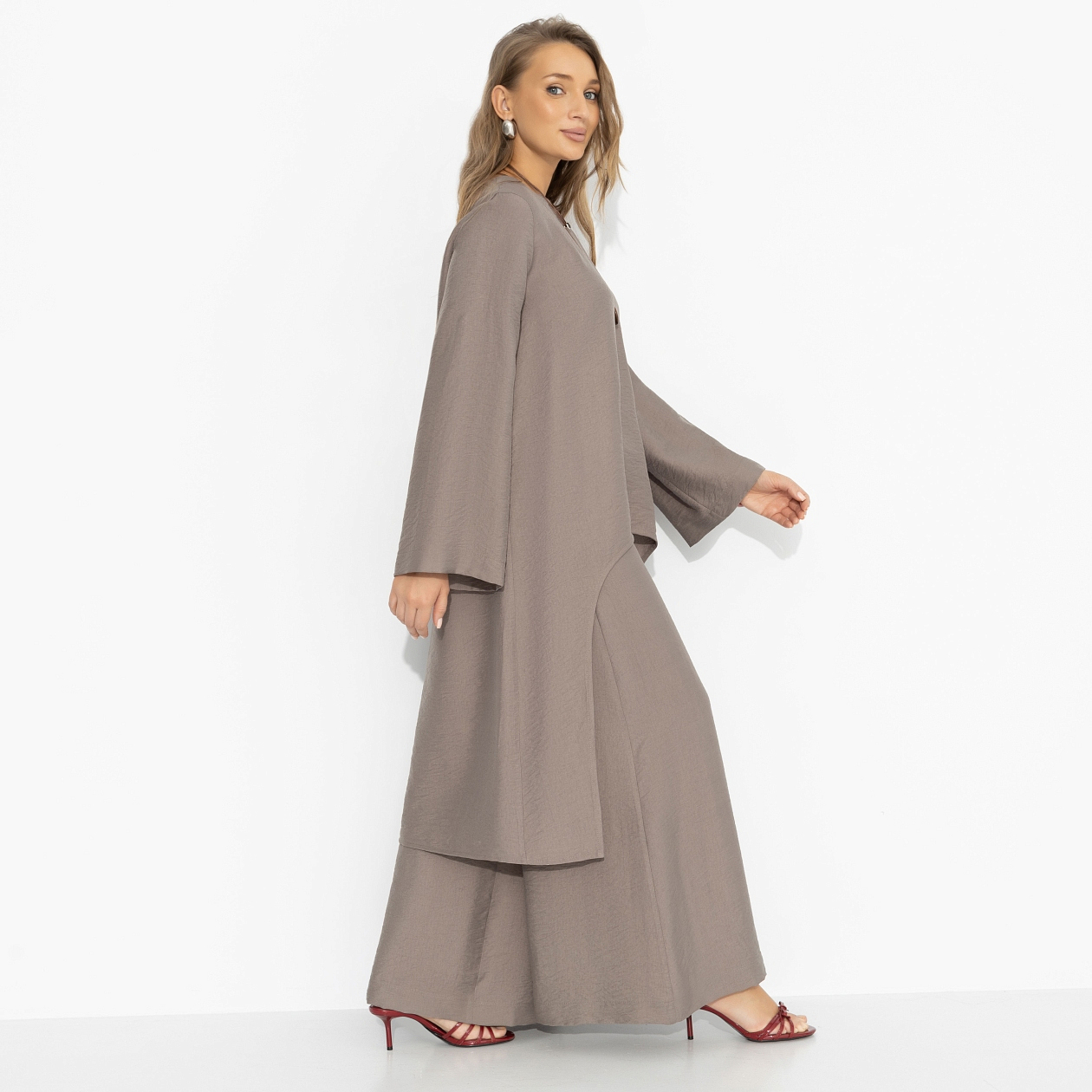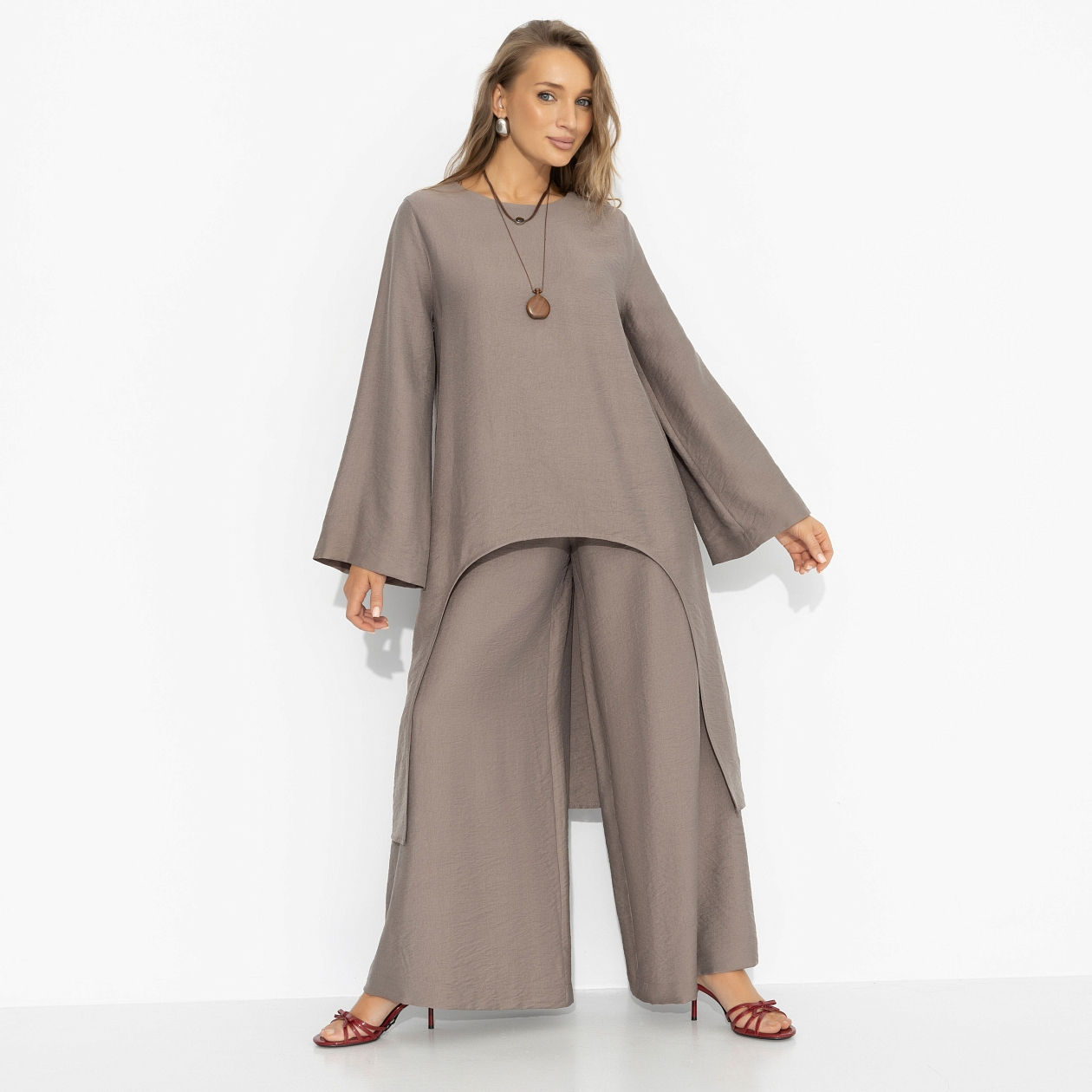 У всех есть своя римская империя. У кого-то это истории и события, а у тебя – идеальный силуэт. Лёгкая, струящаяся туника с асимметричным подолом создаёт движение и вытягивает фигуру, свободный крой дарит воздух и уверенность. Мягкая ткань красиво драпируется, расклешённый рукав добавляет пластики. В этом образе легко думать о вечном и смело идти за своими целями – величие начинается с комфорта. Миксуйте с джинсами, белыми брюками или дополните комплект брюками из той же ткани.