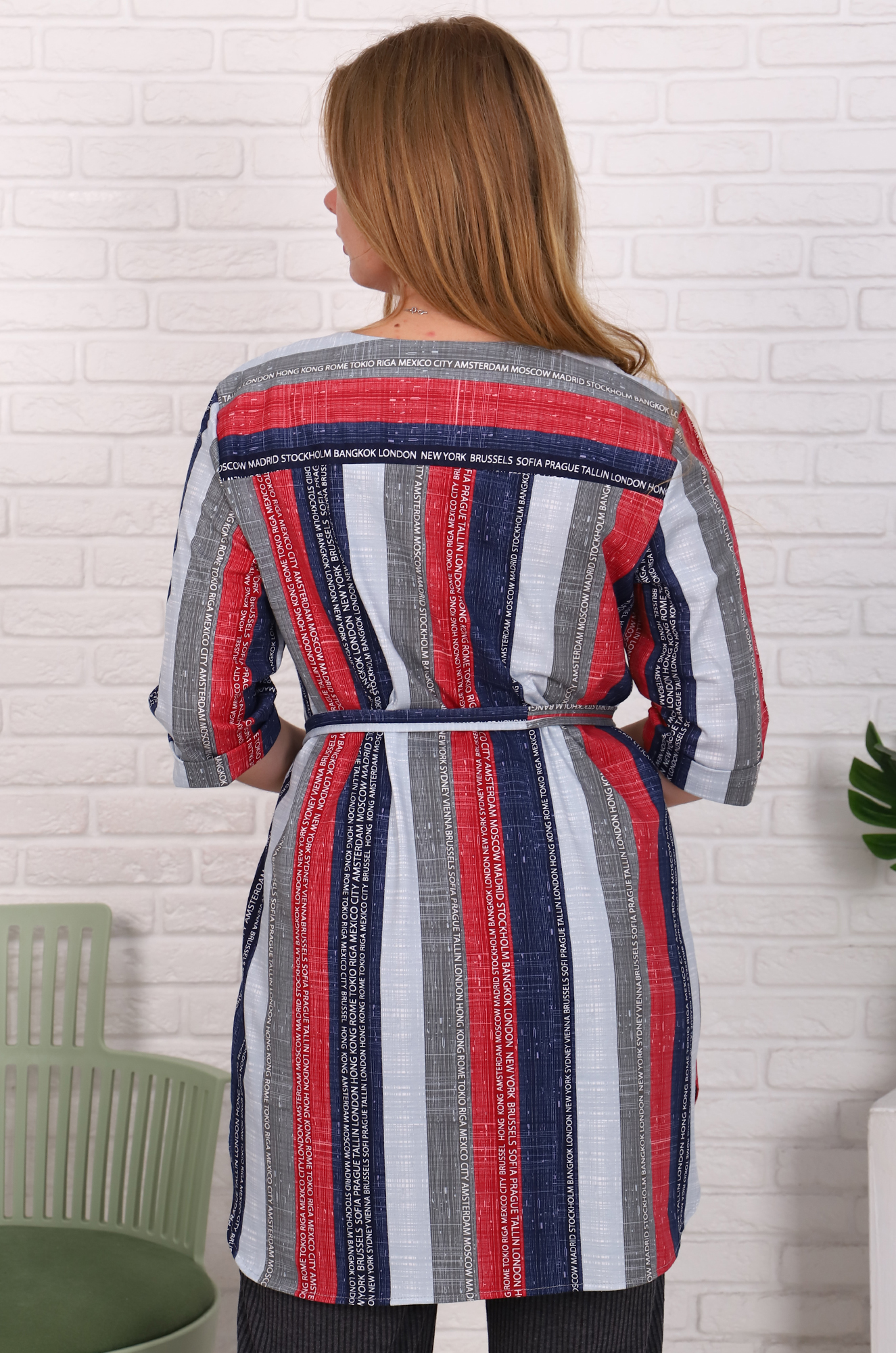 Женская хлопковая туника для дам с пышными формами. Модель прямого кроя, с удлинённой спинкой, на полочке декоративная планка с пуговицами, рукав 3/4. В комплекте идёт тонкий поясок. Ткань кулирка.