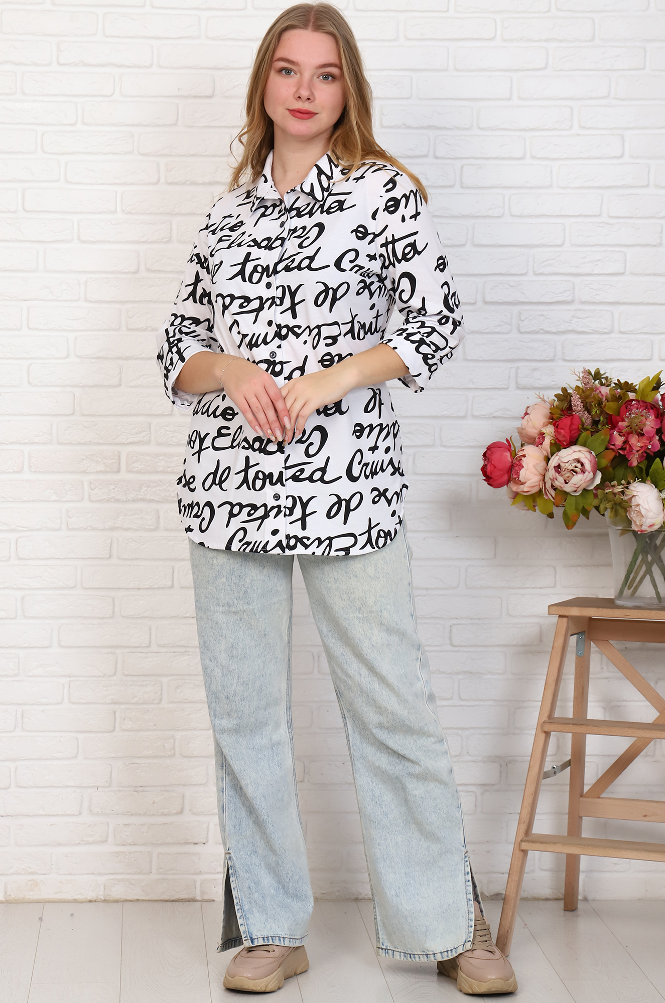 Популярная туника "рубашечного кроя" из мягкого трикотажного полотна. Модель с отложным воротником, рукав 3/4, на манжете из основной ткани, по бокам круглые разрезы. Отличный вариант к шортам, джинсам, леггинсам или к узким брючкам на каждый день!
