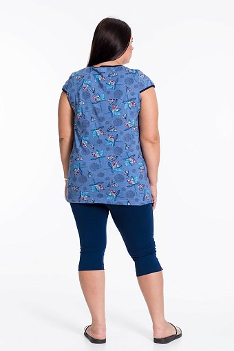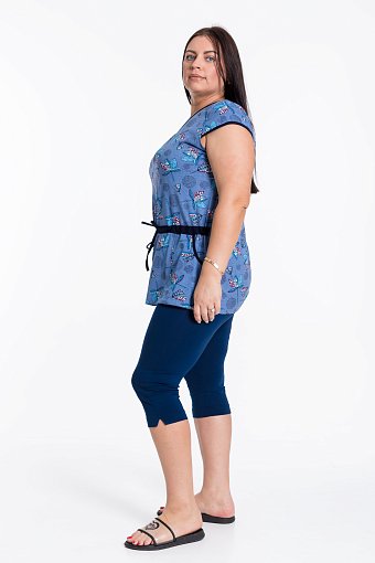 Домашняя футболка с коротким рукавом выполнена из натуральной хлопковой ткани. Цветочный рисунок приятно радует глаз. Футболка регулируется на поясе с помощью завязок, по бокам расположены карманы. Округлый вырез горловины и низ рукавов окантован бейкой.