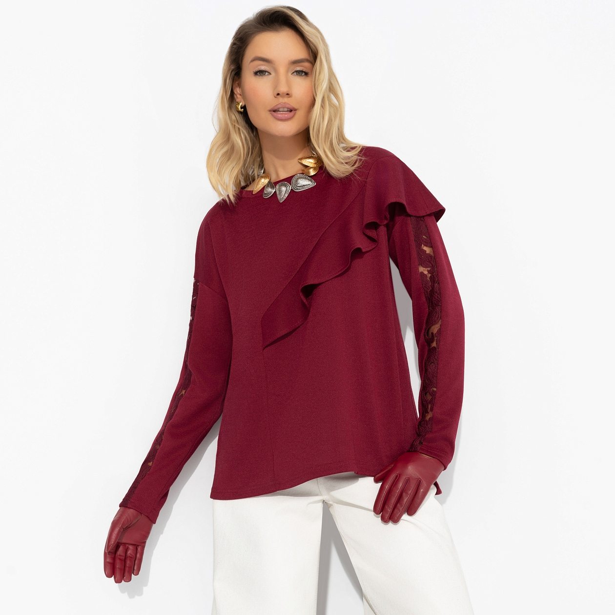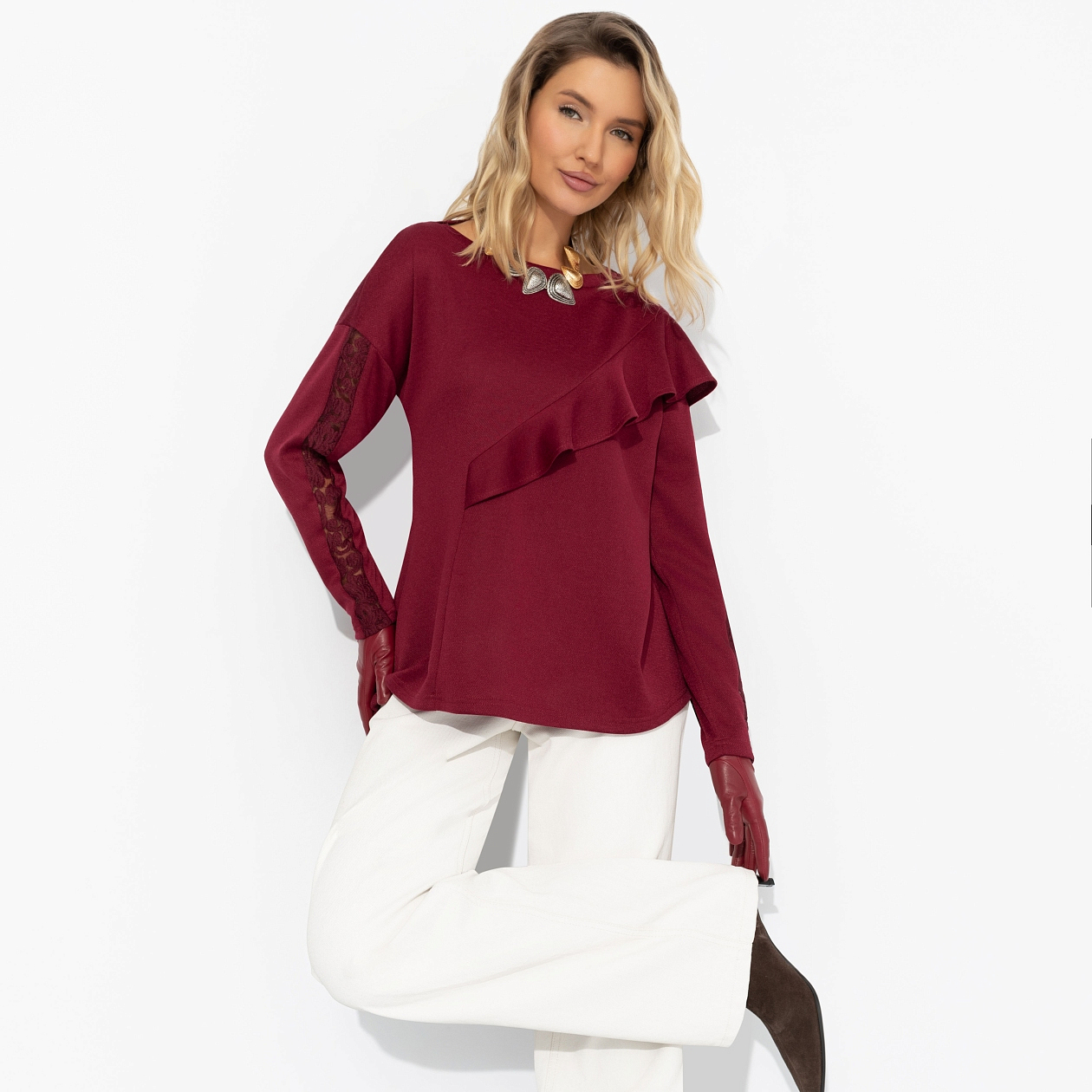 Ваш талисман на прохладное время года от ЧАРУТТИ. Глубокий винный цвет, акцентный крой изделия и шлейф женственности, обычно не свойственный столь комфортным изделиям. Туника ЧАРУТТИ создана для теплых объятий. Туника прямого силуэта. Объемный декор в виде рюш по центральной части изделия. Тонкая вставка кружева в тон изделия по рукавам.