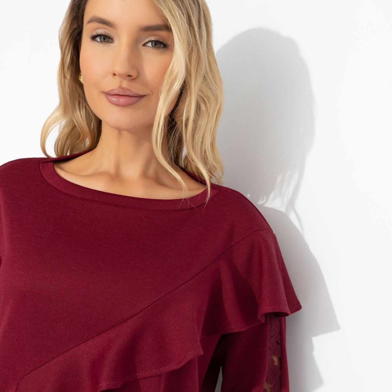 Ваш талисман на прохладное время года от ЧАРУТТИ. Глубокий винный цвет, акцентный крой изделия и шлейф женственности, обычно не свойственный столь комфортным изделиям. Туника ЧАРУТТИ создана для теплых объятий. Туника прямого силуэта. Объемный декор в виде рюш по центральной части изделия. Тонкая вставка кружева в тон изделия по рукавам.
