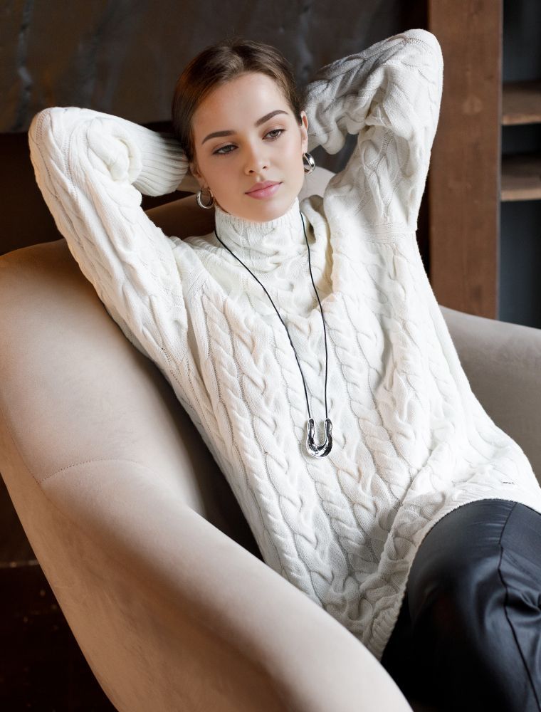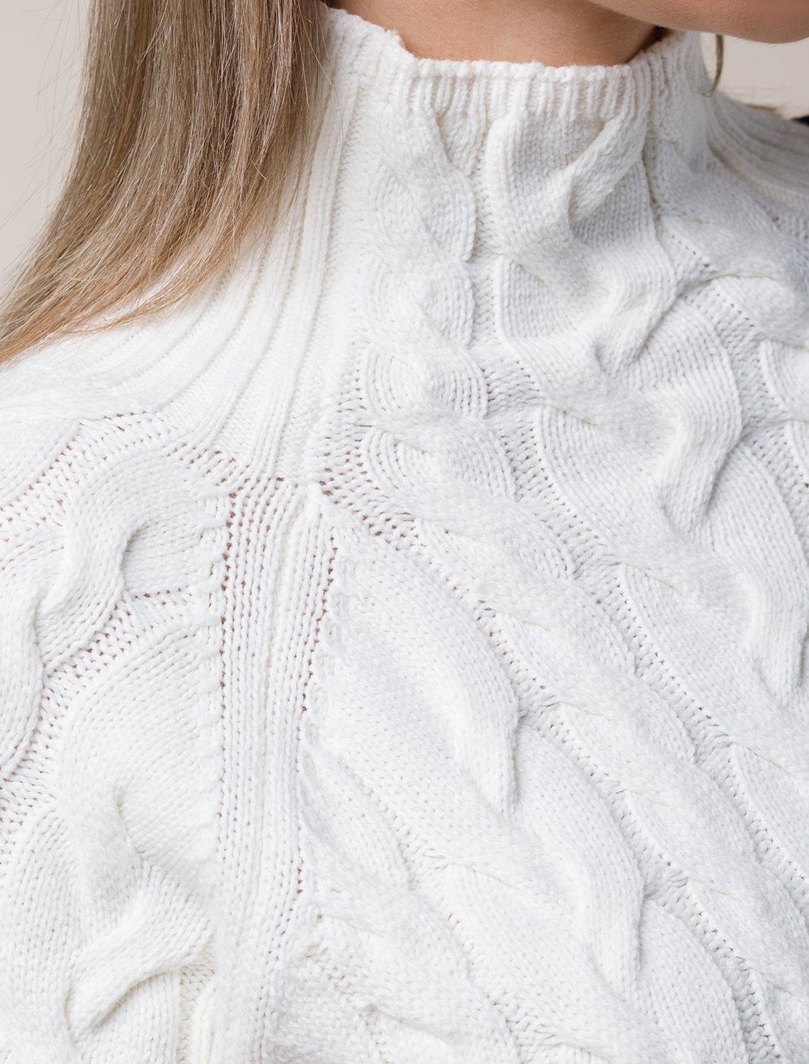 Свитер выполнен из мягкой хлопковой пряжи фактурной вязки с добавлением акрила. Удлиненная модель силуэта over-size с воротом-стойка и узором косы во всю длину. Хорошо поддерживает тепло, при этом не перегревая тело. Сохраняет первоначальный внешний вид даже после множества стирок. Свободный силуэт позволяет носить изделие на футболку или рубашку с любым низом. Из украшений металлический логотип бренда.