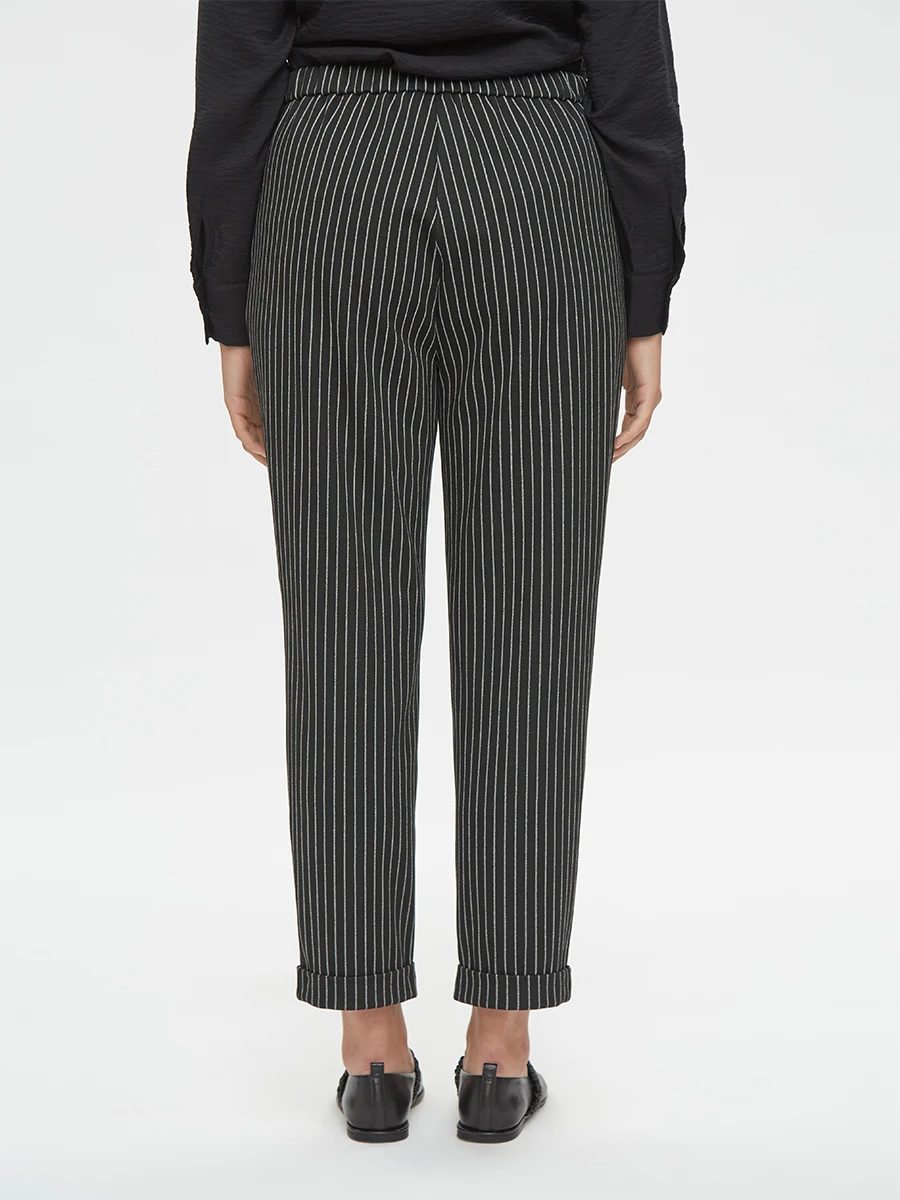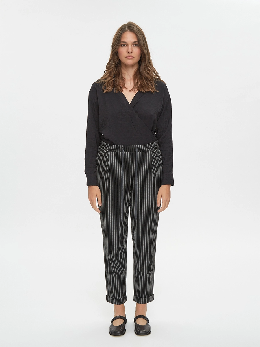 Черные укороченные брюки в белую полоску. Модель свободного зауженного силуэта с отворотами по низу. Широкий пояс на завязках с резиновыми вставками дает возможность самостоятельно регулировать фиксацию на талии. Чтобы усилить эффект от вертикальных полос, можно добавить к образу однотонный черный пиджак свободного кроя - это еще больше вытянет силуэт, но при этом не будет выглядеть слишком официально из-за особенности кроя брюк.