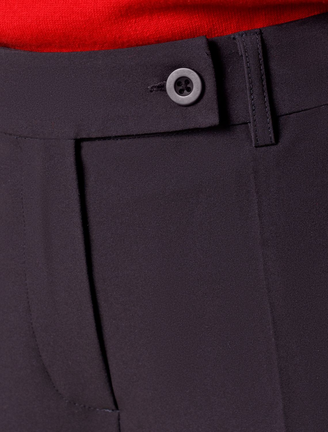 Укороченные брюки выполнены из фактурной черной поливискозы. Модель дополнена боковыми карманами и отлично подойдет как для строгого делового образа с блузкой и жакетом, так и для более расслабленного с футболкой и водолазкой. Эластичный материал изделия поддерживает оптимальный микроклимат, формоустойчивость и комфорт в течение всего дня.