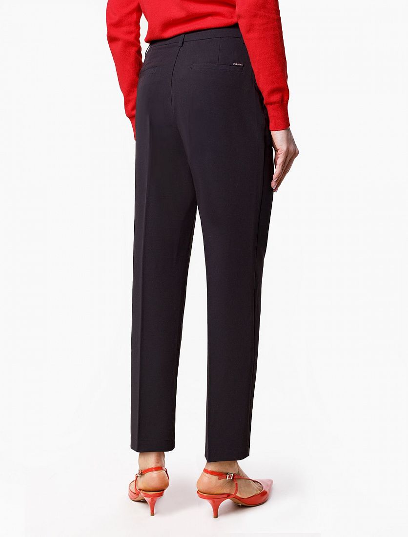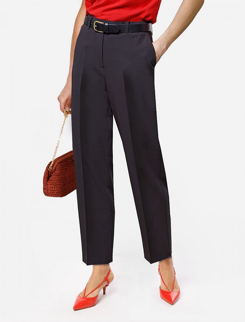 Укороченные брюки выполнены из фактурной черной поливискозы. Модель дополнена боковыми карманами и отлично подойдет как для строгого делового образа с блузкой и жакетом, так и для более расслабленного с футболкой и водолазкой. Эластичный материал изделия поддерживает оптимальный микроклимат, формоустойчивость и комфорт в течение всего дня.