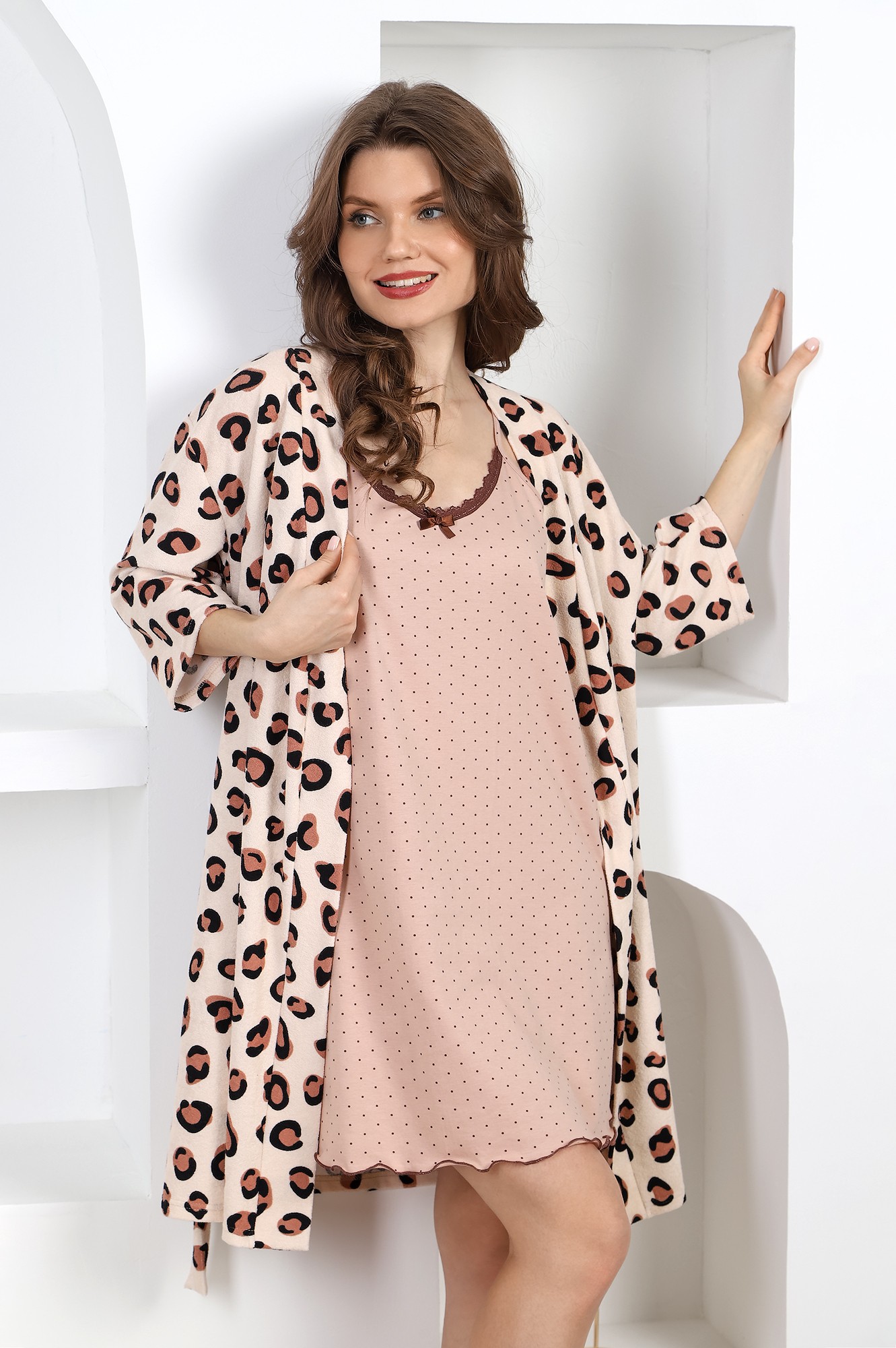 Халат молодежный из трикотажного полотна «махра», на запахе, с втачными рукавами ¾ длины, карманами в боковых швах, со съемным поясом, завязывающимся на талии и продетым в две шлевки. Бортовые срезы и горловина обработаны притачной планкой.