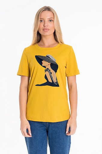 Женская футболка с принтом изготовлена из хлопкового полотна, что обеспечивает комфорт и хорошую воздухопроницаемость. Футболка имеет короткий рукав и круглый вырез горловины, что придает ей классический стильный вид. Такая модель футболки отлично сочетается с джинсами, брюками или юбкой. Изготовленная из натуральной ткани, футболка обеспечит комфорт в течение всего дня.