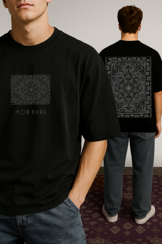 Мой вайб — и никаких компромиссов! Черная футболка оверсайз с дерзким принтом ковром и надписью моментально приковывает внимание и задаёт настроение на каждый день. Футболка с ковром на спине – тренд 2025 года.