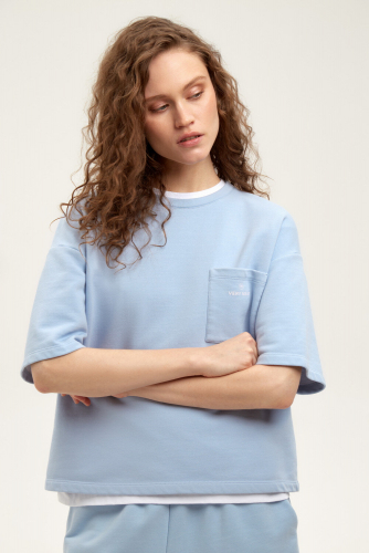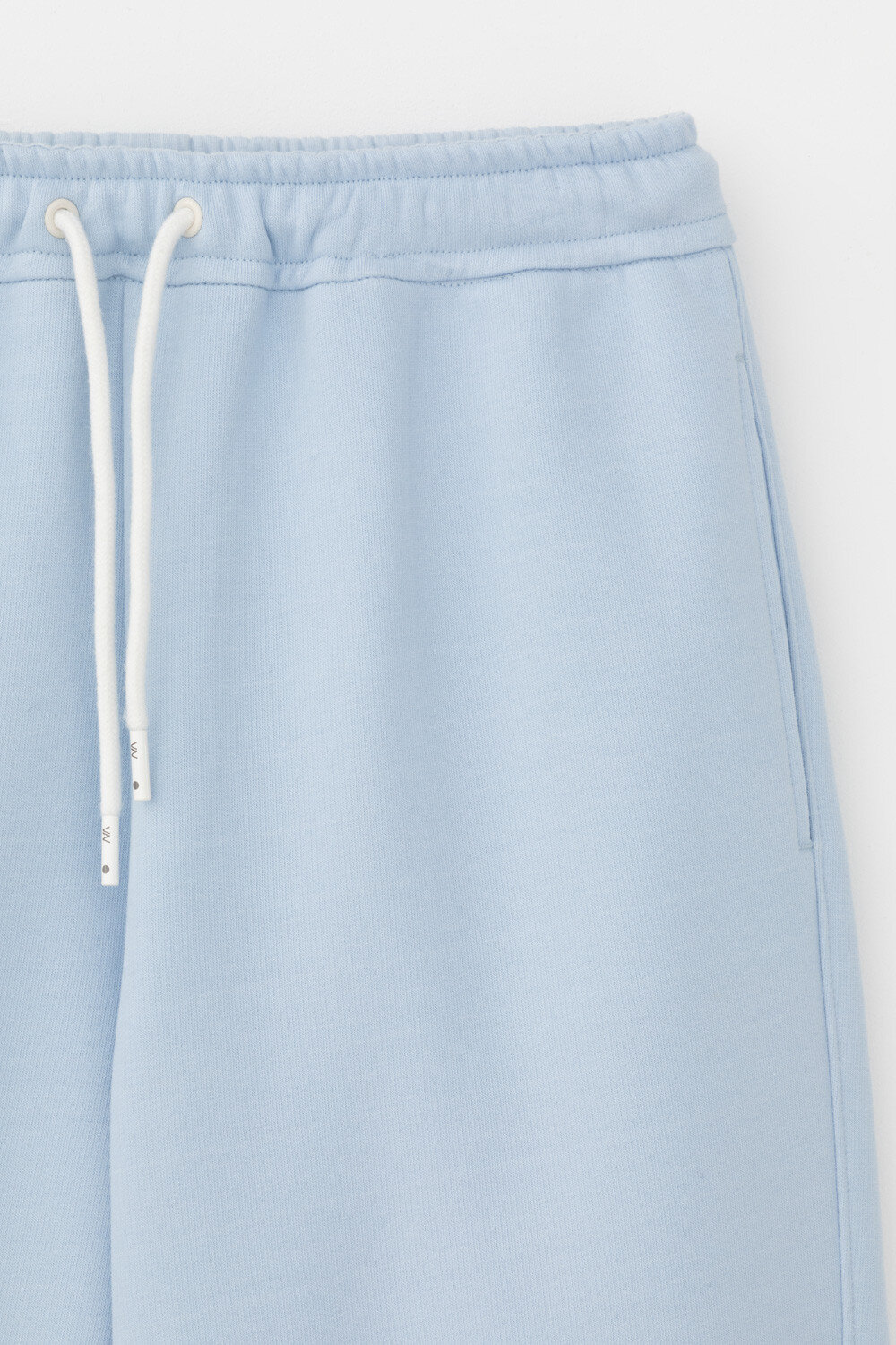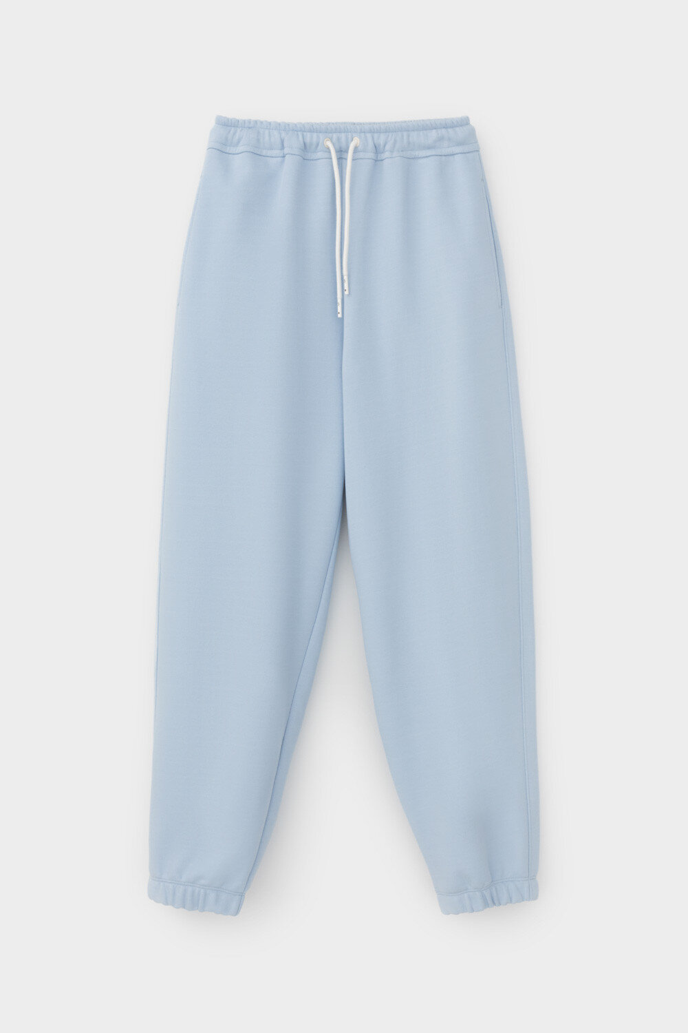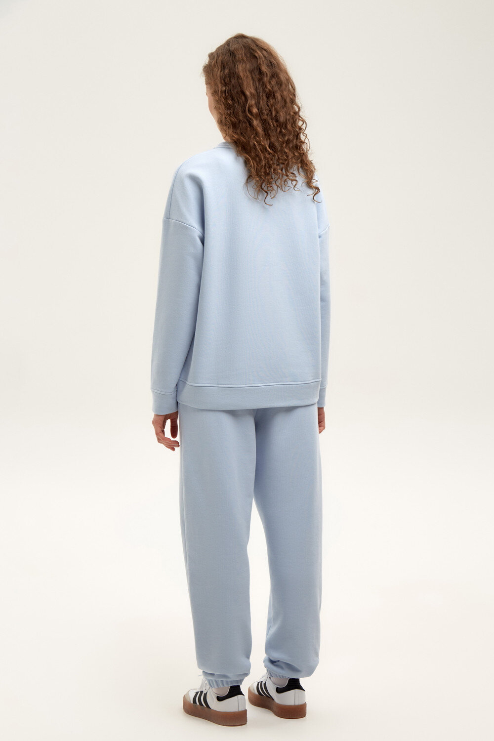 Брюки из мягкого двухцветного футера. Внутренняя сторона изделия представлена в натуральном цвете хлопка, внешняя в нежно-голубом. За счет использования крашенной пряжи, данный вид полотна прошел минимальную обработку, что придало изделию мягкость и шелковистость.
